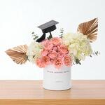 Eucalyptus - 4 pce white hydrangeas - 2 pce feuilles de palmier séchées - 2 pce roses spray Juliet - 5 pce