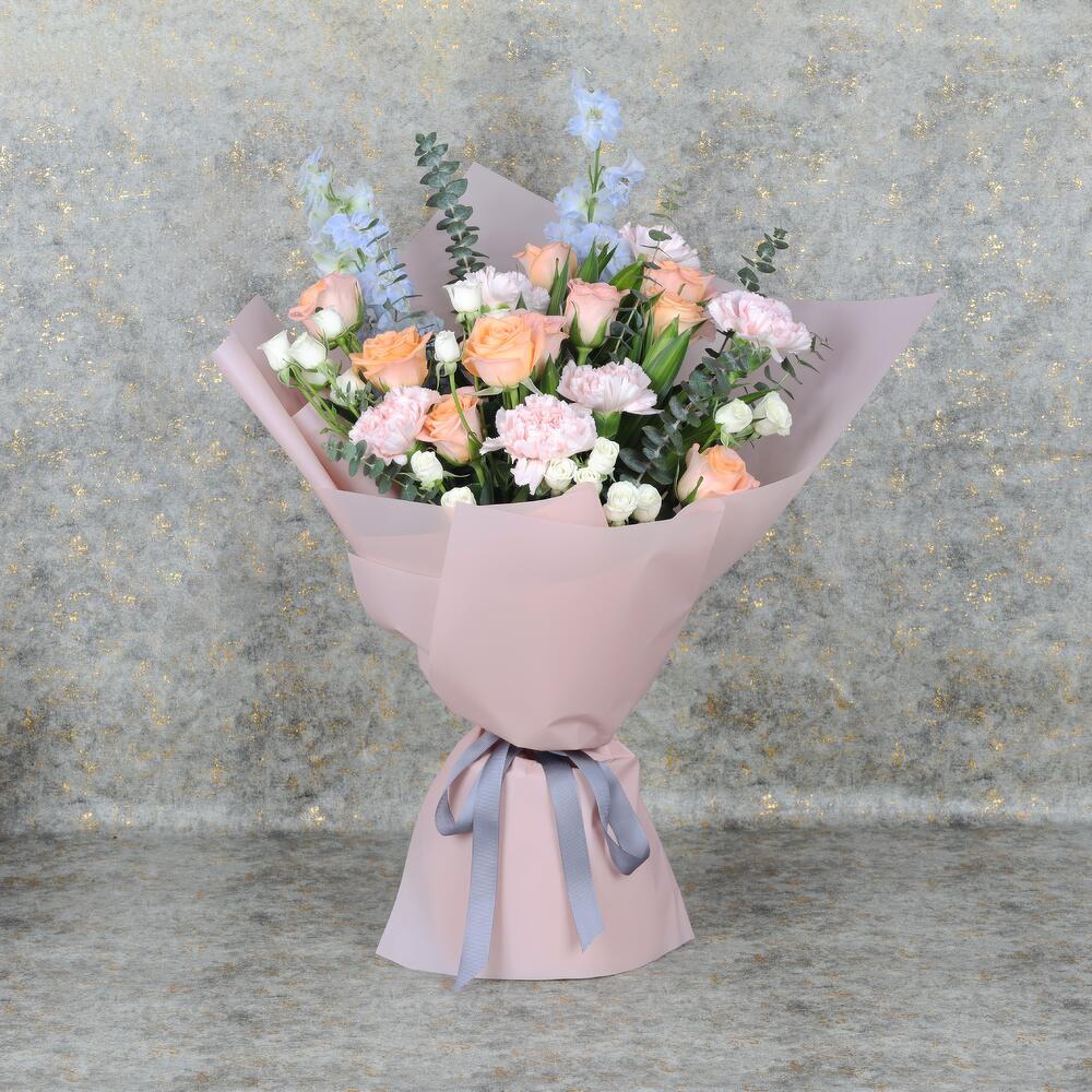 10 roses pêche, 6 œillets roses, 5 tiges de roses blanches en spray, 2 delphiniums bleu ciel, feuillage - 2 Song Of Jamaica et 7 tiges d'eucalyptus, joliment enveloppé dans un papier de couleur pastel, noué d'un ruban gris.