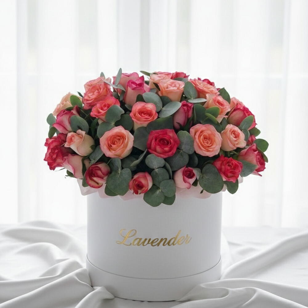 Celebrate grace, strength, and timeless femininity with our exquisite Peach Coral Rose Elegance Box, thoughtfully designed to honor Women’s Day. This luxurious floral arrangement showcases a stunning blend of soft peach roses and vibrant coral roses, beautifully arranged in a premium white round hat box for a refined and sophisticated presentation. The harmonious combination of peach and coral tones symbolizes appreciation, admiration, warmth, and gratitude making this arrangement a meaningful tribute to the inspiring women who make a difference every day. Accented with fresh eucalyptus foliage for added texture and elegance, this design offers a perfect balance of softness and modern luxury. Presented in a chic white designer box with elegant gold detailing, this arrangement creates a graceful yet eye-catching statement ideal for celebrating Women’s Day with style and heartfelt sentiment.