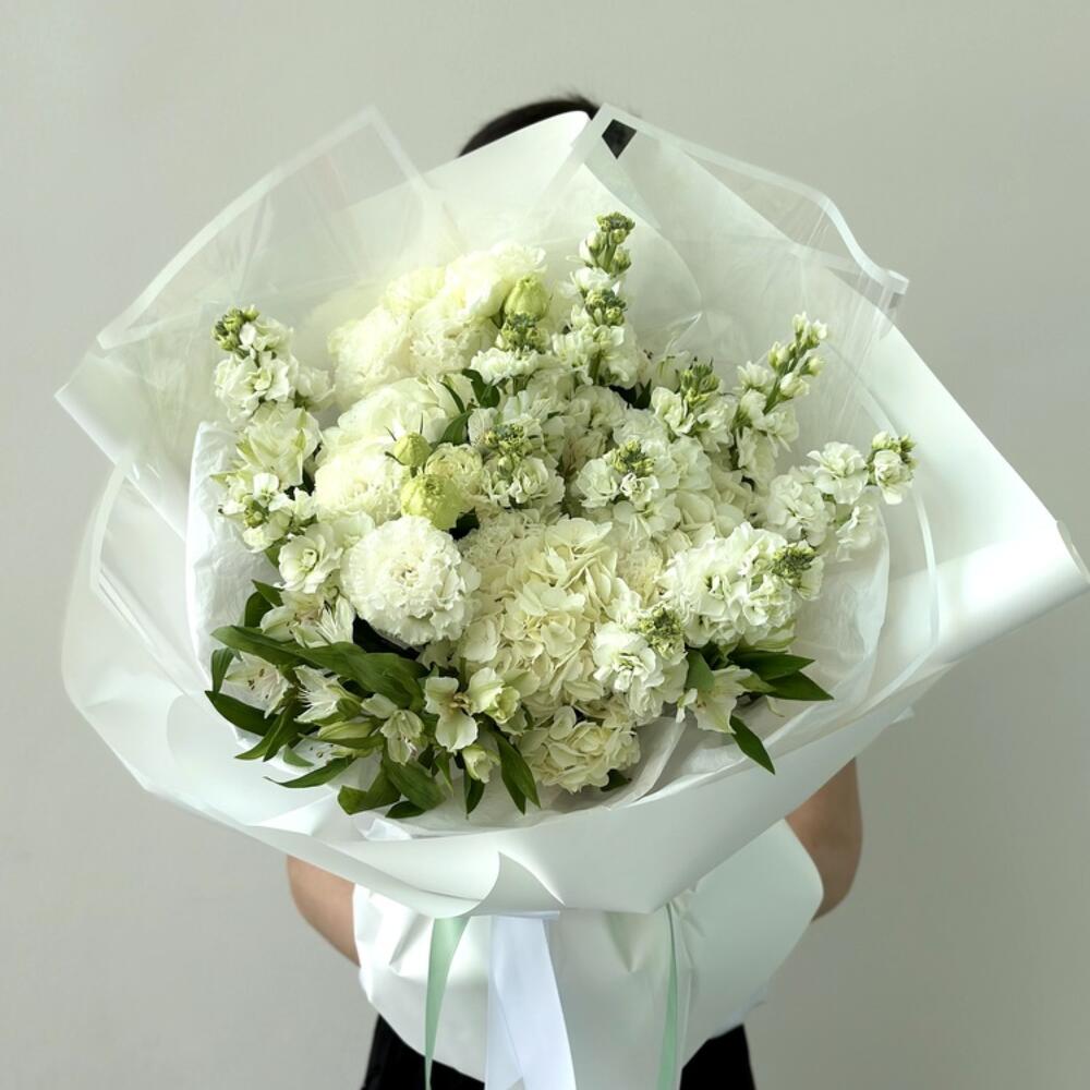 Ribbon - 1 pce Hydrangea - 3 pce Alstroemeria - 6 pce Lisianthus - 5 pce wrapping paper - 1 pce mattiola - 10 pce