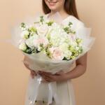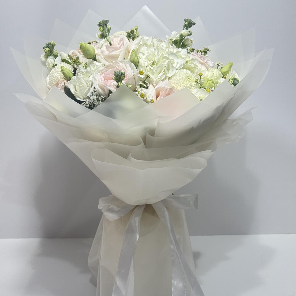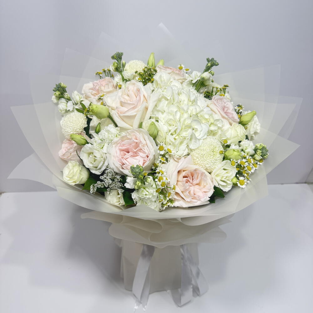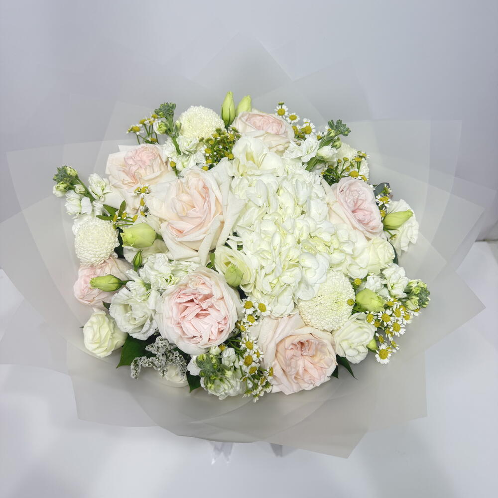 Hydrangea - 1 pce ohara rose - 7 pce lisanthus - 4 pce matholia - 4 pce