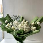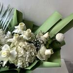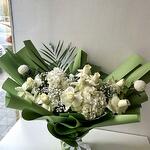 white hydrangea - 2 pce roses blanches - 10 pce ping-pong blanc - 2 pce gypsophile - 3 pce feuille de canne - 1 pce