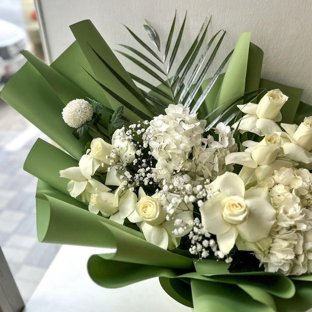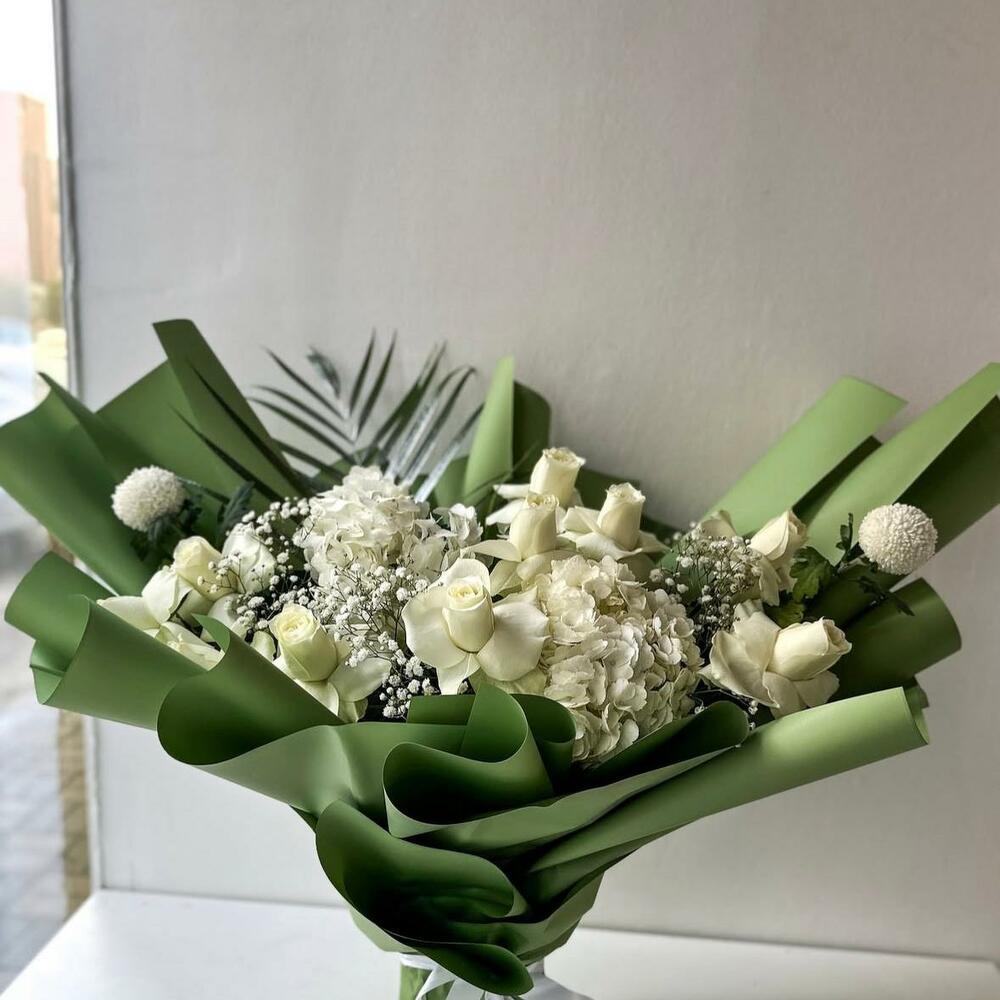 white hydrangea - 2 pce roses blanches - 10 pce ping-pong blanc - 2 pce gypsophile - 3 pce feuille de canne - 1 pce