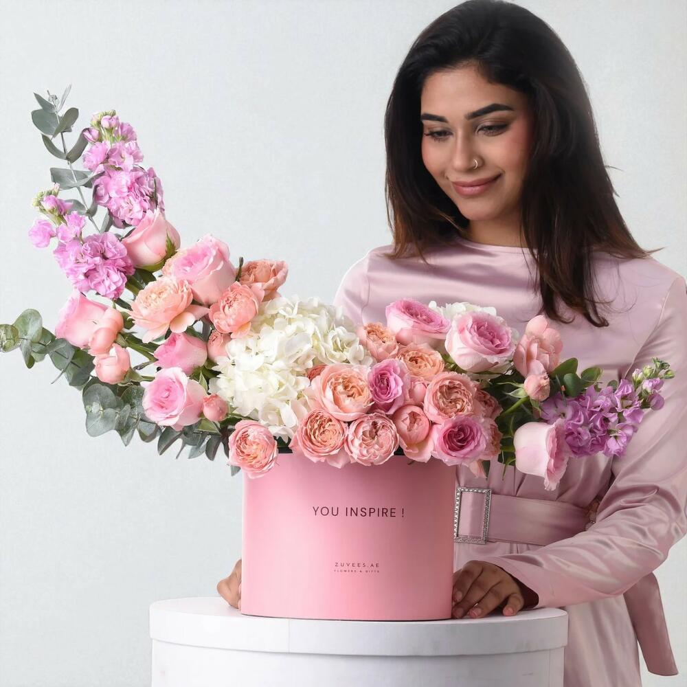 Célébrez la grâce, la force et la beauté intemporelle des femmes qui vous inspirent avec la Pearls Petals Inspire Box — une composition florale pensée avec soin, enveloppée de douces teintes rosées et présentée avec élégance. Logée dans l'élégante Inspire Box, cette création luxueuse présente une palette fluide de roses, de pêches et de blancs, faisant écho à des sentiments d'admiration, d'amour et de profonde reconnaissance. Qu'il s'agisse de la Journée des femmes émiraties ou de toute occasion qui appelle une célébration sincère, cet arrangement véhicule un message qui perdure.