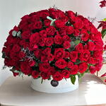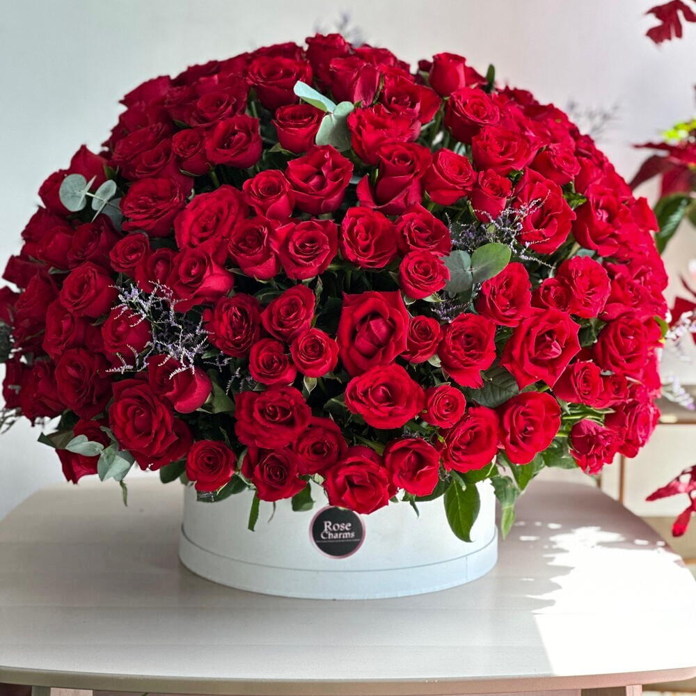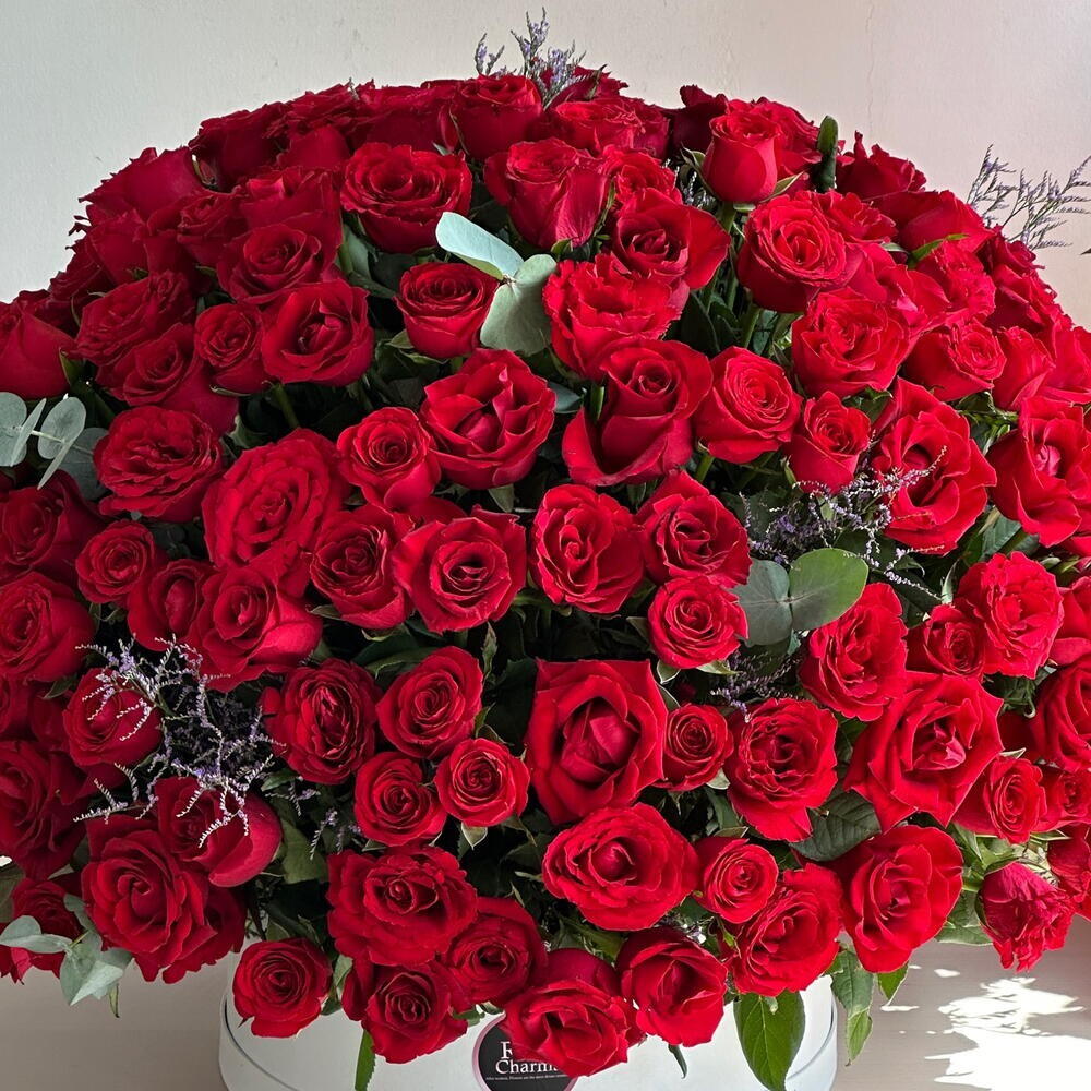 Découvrez notre composition Royal Romance, un chef-d'œuvre exquis mettant en valeur 201 superbes roses rouges élégamment présentées dans une boîte blanche immaculée, ornée de feuilles d'eucalyptus parfumées pour un charme supplémentaire