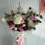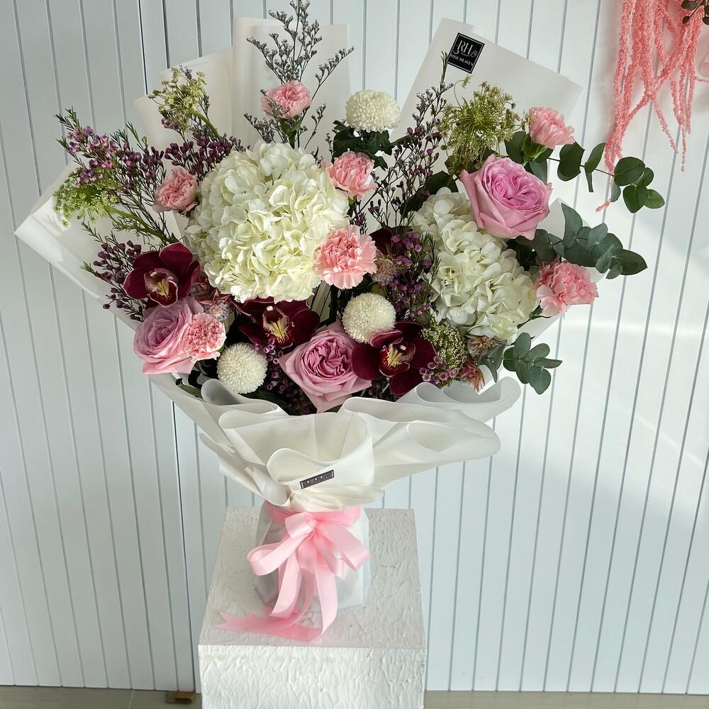 Hydrangea - 2 pce œillets - 5 pce ping-pong - 3 pce roses - 3 pce sambadyam fleurs coupées - 4 pce