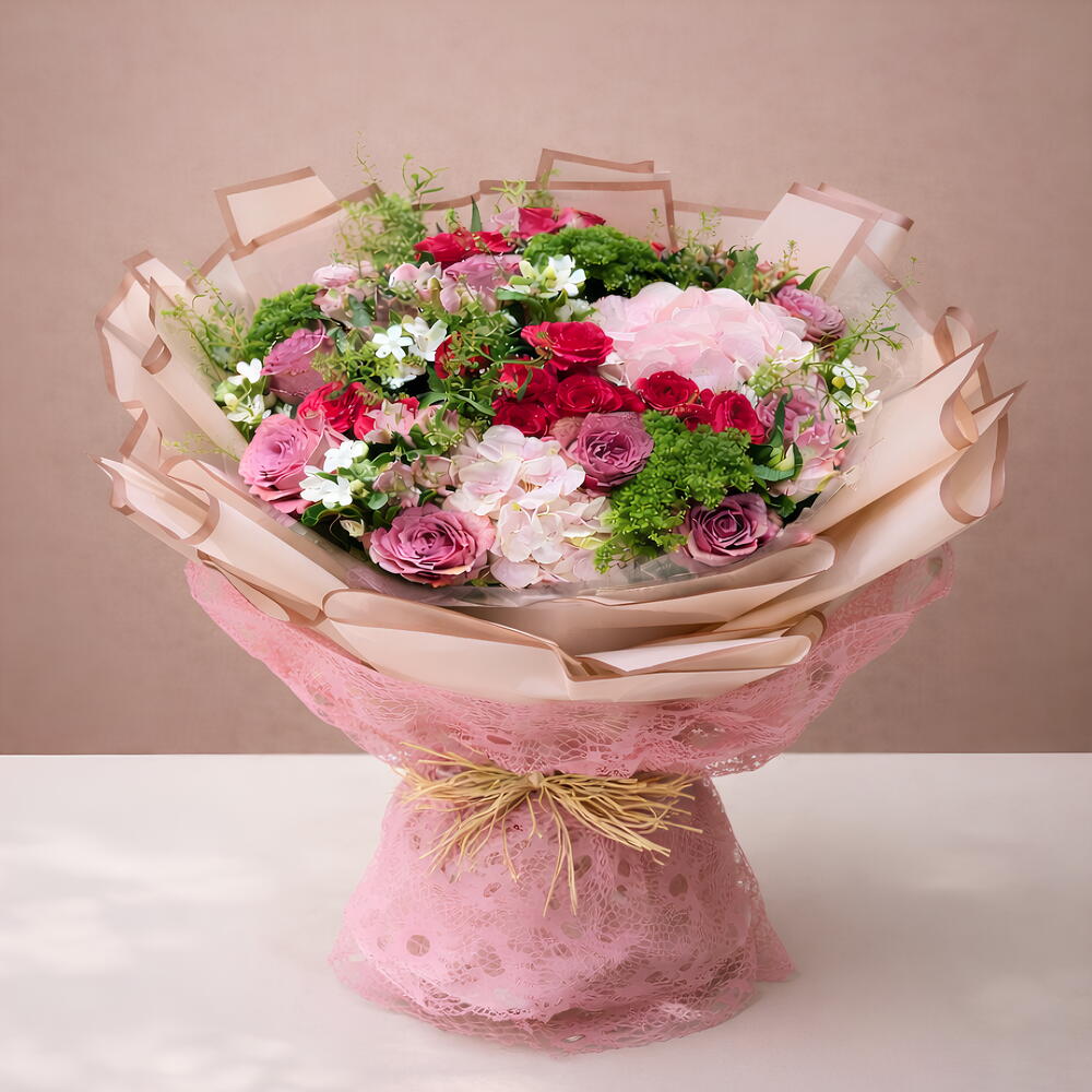 Rehaussez n'importe quel espace avec l'envoûtant arrangement floral PINK BEAUTY, présentant un délicieux mélange d'oxypetalum blancs (de saison), de délicates roses roses, d'hortensias luxuriants, de roses spray charmantes et de verdure vibrante de trachelium. Confectionné à la main à la perfection, cet arrangement dégage élégance et charme, ce qui en fait un choix idéal pour les mariages, les occasions spéciales ou tout simplement pour ajouter une touche de beauté naturelle à la décoration de votre maison. Chaque fleur est soigneusement sélectionnée et disposée pour créer une présentation harmonieuse qui captive les sens et apporte de la joie à tout environnement.