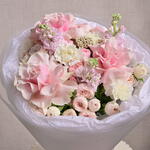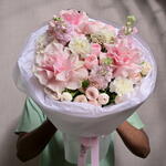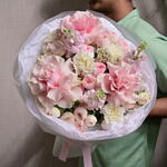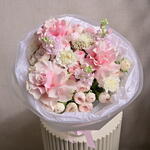 Un bouquet doux et élégant composé de roses pivoine, d'œillets roses et de roses Mondial de couleur rose, complété par de la matthiola et de l'ozothamnus séché. Un cadeau parfait pour toute occasion spéciale.