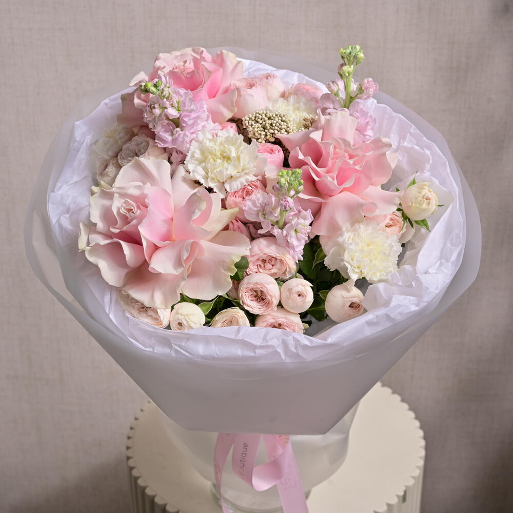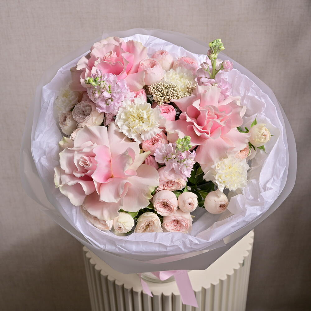Un bouquet doux et élégant composé de roses pivoine, d'œillets roses et de roses Mondial de couleur rose, complété par de la matthiola et de l'ozothamnus séché. Un cadeau parfait pour toute occasion spéciale.