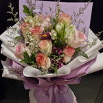 alstroemeria white - 2 pce rose - 12 pce limonium purple filler - 8 pce alstroemère violet foncé - 2 pce feuilles lourdes - 5 pce mitchiola blanc - 1 pce