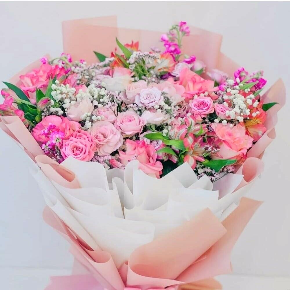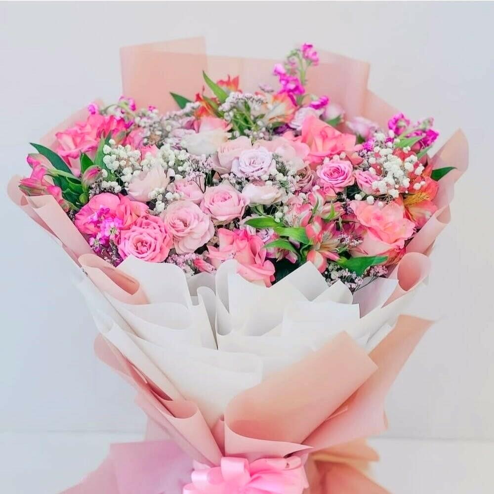 Ruscus - 5 pce Pink rose - 5 pce Gypsophila - 5 pce rose branchue rose - 5 pce matthiola rose - 4 pce alstroemeria pink - 4 pce