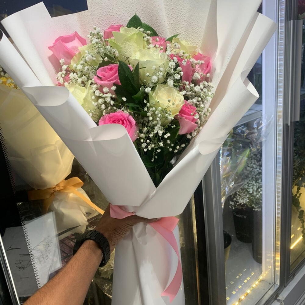 Ruscus - 3 pce Pink rose - 8 pce White rose - 6 pce gypse - 5 pce
