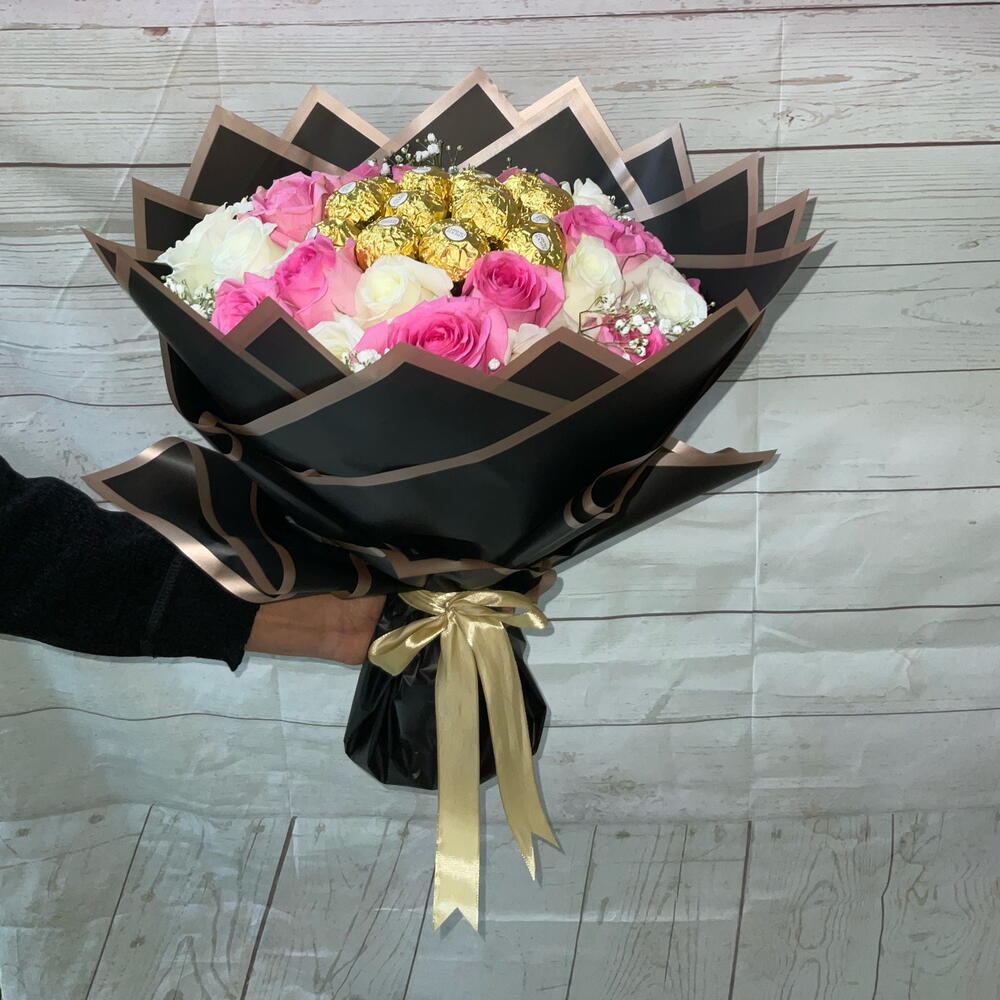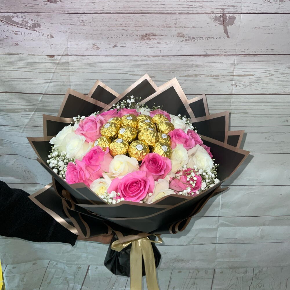 Offrez-vous ou surprenez votre proche avec ce somptueux Mono Bouquet. Confectionné avec un soin impeccable, il contient 16 pièces de chocolats délicieux, 25 magnifiques roses fraîches et une délicate touche de gypsophile – le tout joliment enveloppé de façon artistique avec cinq feuilles de papier de qualité supérieure. Ce Mono Bouquet exprime toute votre affection, un choix parfait pour toute occasion. Découvrez l'alliance des fleurs et du chocolat qui promet un festin pour vos sens.