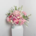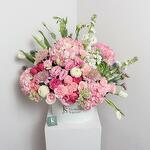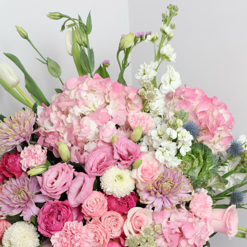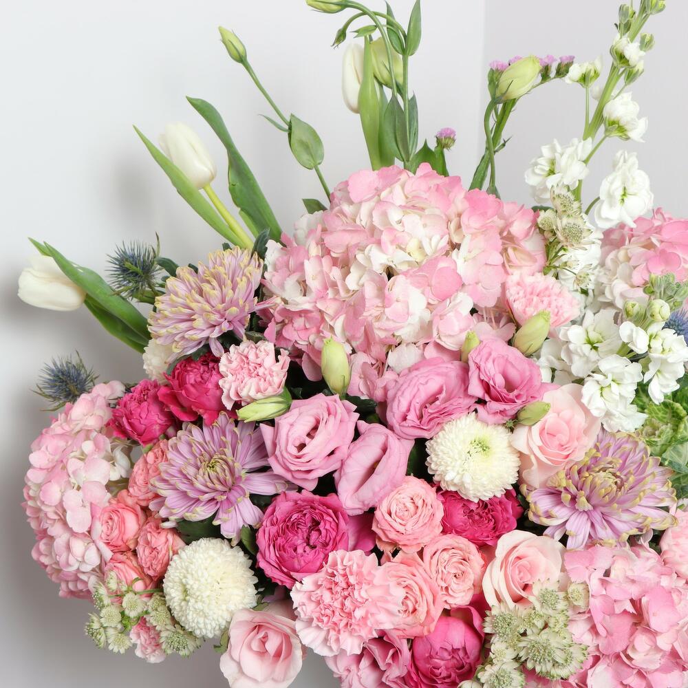 Tulips - 5 pce Hydrangea - 4 pce Chrysanthemum - 3 pce Lisianthus - 3 pce matthiola - 3 pce roses - 6 pce