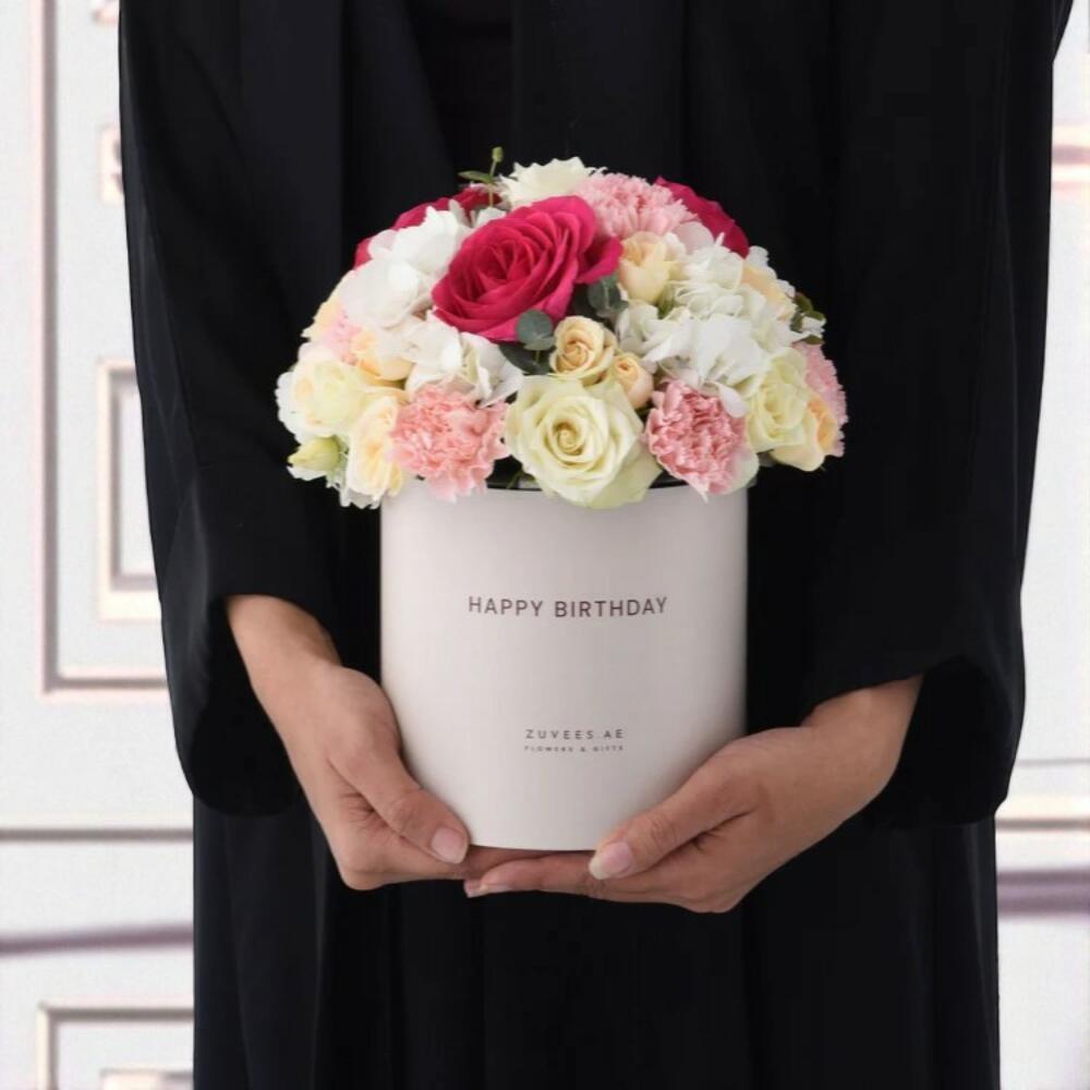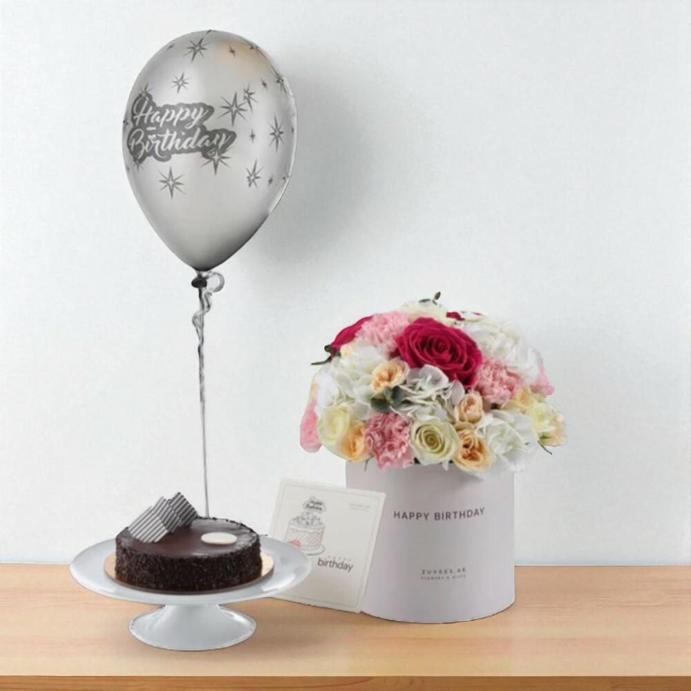 Pink Floyd Boîte florale ivoire d'anniversaire Combo gâteau – Élégant cadeau floral avec gâteau au chocolat Ballon