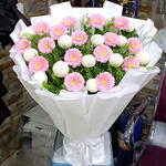 Elegant bouquet featuring vibrant pink gerbera daisies and soft white pingpong chrysanthemums, beautifully arranged for birthdays, anniversaries, and celebrations.