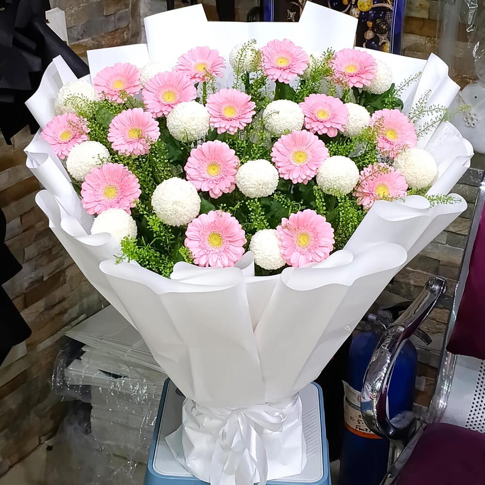 Elegant bouquet featuring vibrant pink gerbera daisies and soft white pingpong chrysanthemums, beautifully arranged for birthdays, anniversaries, and celebrations.