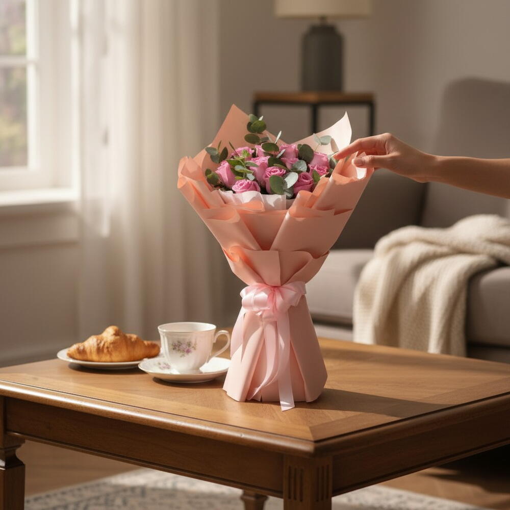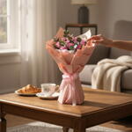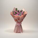 Ribbon - 1 pce Eucalyptus - 4 pce Pink rose - 11 pce Wrapping - 4 pce