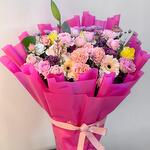 Ce bouquet éclatant est une véritable ode à la couleur et à la joie. Roses rose poudré, gerberas crème et chrysanthèmes vibrants sont harmonieusement agencés, rehaussés de touches de violet et d'un jaune soleil pour un contraste saisissant. Les fleurs sont élégamment enveloppées dans un film fuchsia lumineux et nouées d'un délicat ruban de satin, créant un effet visuel saisissant. Pour conserver la fraîcheur de votre bouquet plus longtemps, recoupez les tiges en biseau et placez-les dans de l'eau propre et fraîche. Changez l'eau quotidiennement et conservez le bouquet à l'abri de la lumière directe du soleil et des sources de chaleur. Ce bouquet joyeux saura égayer n'importe quelle humeur grâce à son charme délicat et ses couleurs éclatantes. Idéal pour les moments précieux tels que les anniversaires, les fêtes ou toute autre occasion spéciale, ce bouquet de fleurs transcende l'ordinaire et devient une expression tangible d'amour. Offrez-le en cadeau d'anniversaire, exprimez vos vœux d'anniversaire de mariage, souhaitez un prompt rétablissement ou offrez simplement un moment de tendresse à un être cher.