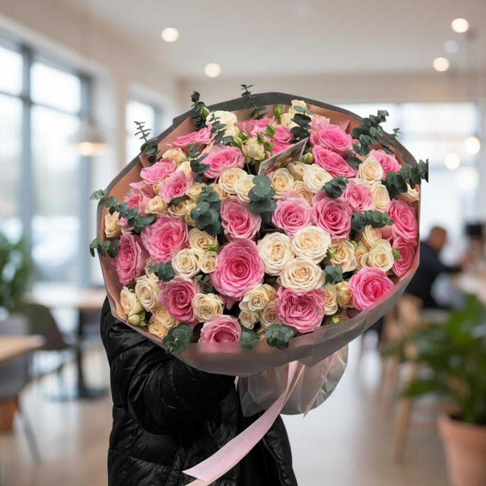 Faites sensation avec ce somptueux bouquet haut de gamme. Composé de 31 roses rose vif et de 15 roses branchues pêche délicates, cet arrangement floral offre un volume et une texture exceptionnels. Agrémenté d'eucalyptus frais et d'un élégant emballage givré, il constitue le cadeau idéal pour un anniversaire ou toute autre occasion. Composé à la main, il est conçu pour impressionner par sa palette douce et romantique.