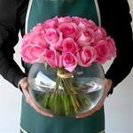 Des - 31 roses Pink Revival dans un bocal à poissons.