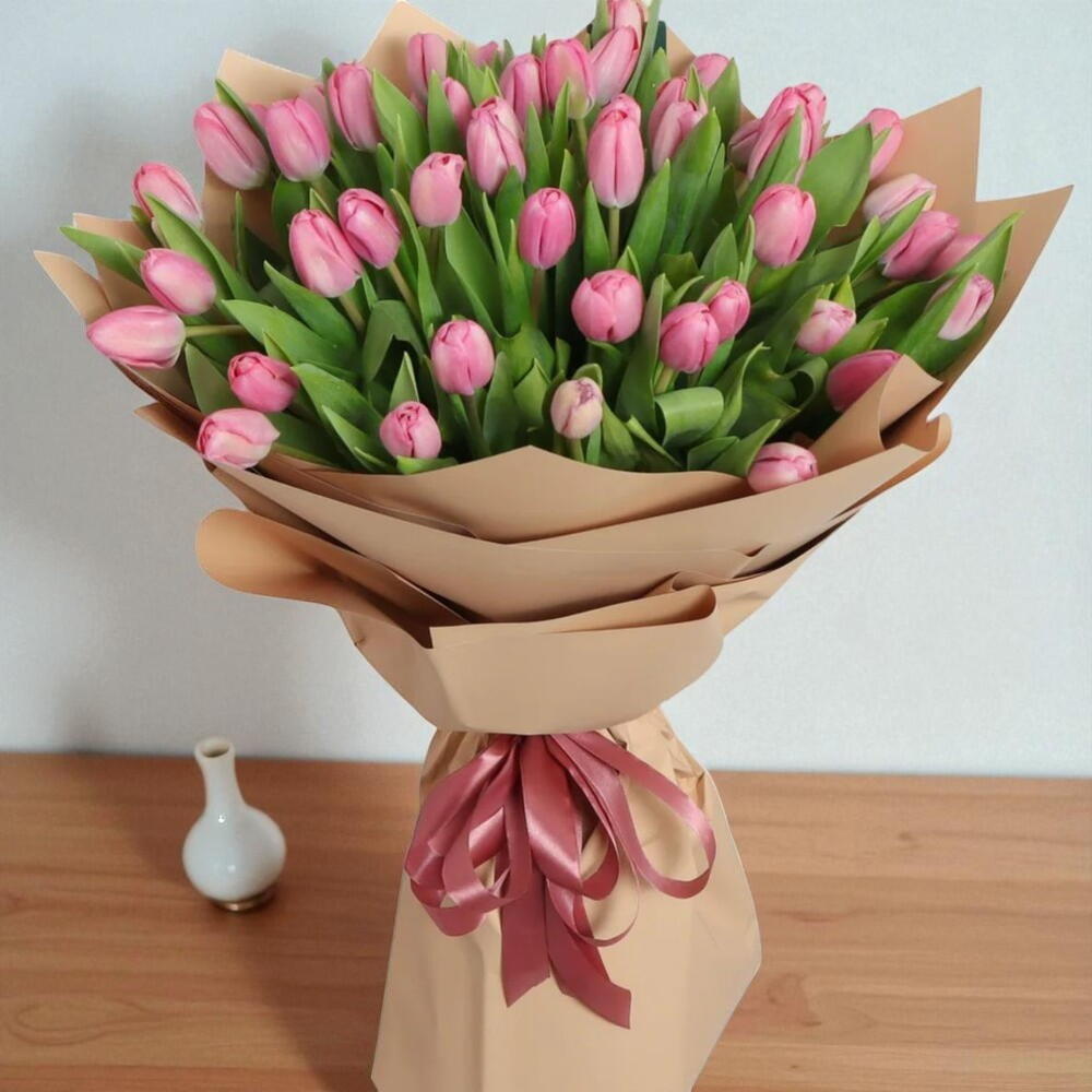 Délicat, frais et plein de charme — ce bouquet de tulipes roses est le moyen parfait d'égayer la journée de quelqu'un. Chaque tulipe symbolise l'affection, le bonheur et la promesse de nouveaux départs. Enveloppé dans un papier beige doux et noué d'un ruban de satin gracieux, l'arrangement dégage une élégance discrète. Idéal pour les anniversaires, les célébrations du printemps ou simplement parce que — c'est un cadeau qui parle au cœur. Les tendres pétales roses, associés à de luxuriantes feuilles vertes, créent une allure rafraîchissante et intemporelle. Que votre proche se sente chéri avec ce bouquet débordant de beauté et de sens.