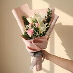 lys oriental blanc - 1 pce pink roses - 3 pce gypsophile - 2 pce