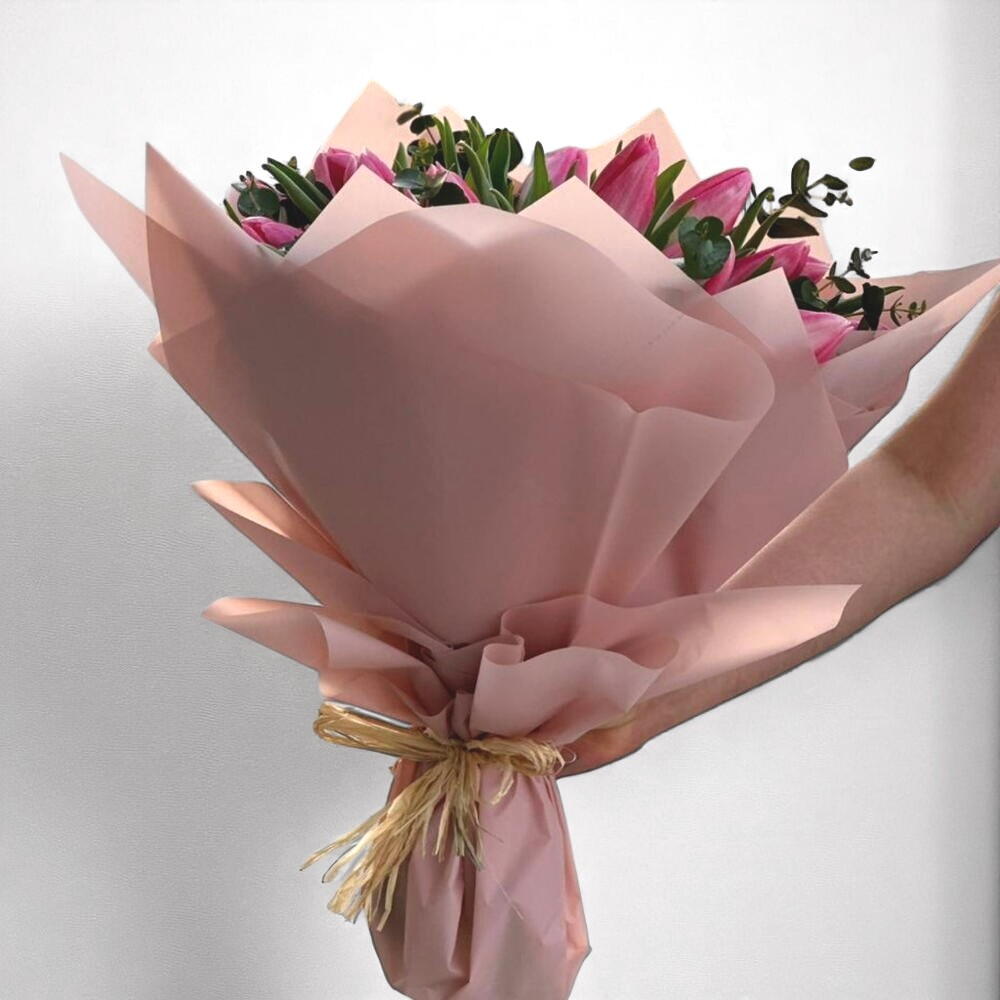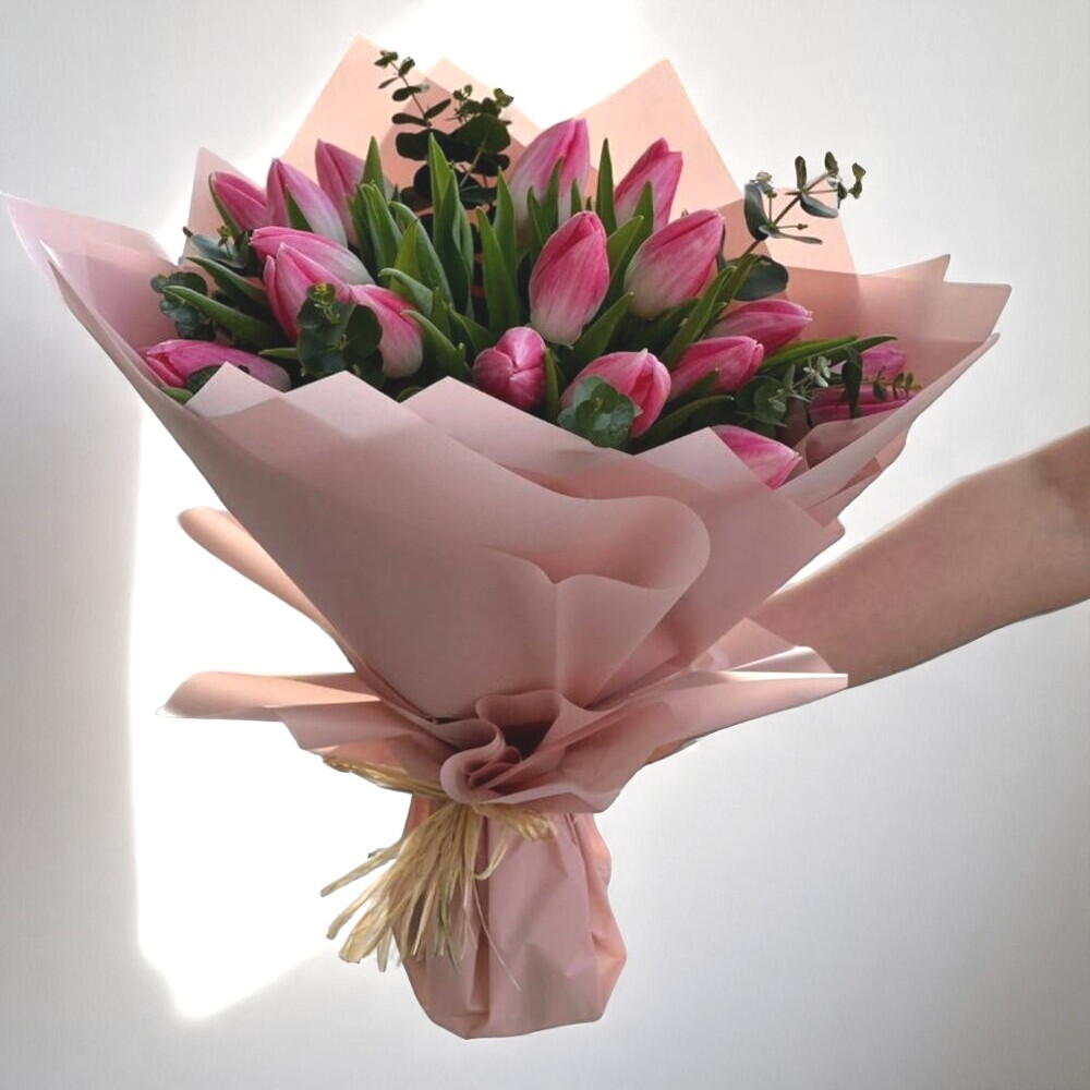 Un élégant bouquet de tulipes d'un rose pâle enveloppé dans un délicat emballage pastel — le geste parfait d'affection et d'admiration. Ces tulipes dégagent fraîcheur, tendresse et renouveau, ce qui les rend idéales pour les anniversaires, les célébrations ou simplement pour égayer la journée de quelqu'un. Le feuillage vert contrastant met en valeur leur teinte douce, ajoutant profondeur et équilibre à la composition. Pour assurer leur longévité, placez le bouquet dans un vase propre avec de l'eau fraîche et coupez les tiges en biais tous les 2 à 3 jours. Conservez-les dans un endroit frais, à l'écart de la lumière directe du soleil et des appareils de chauffage pour une fraîcheur optimale.