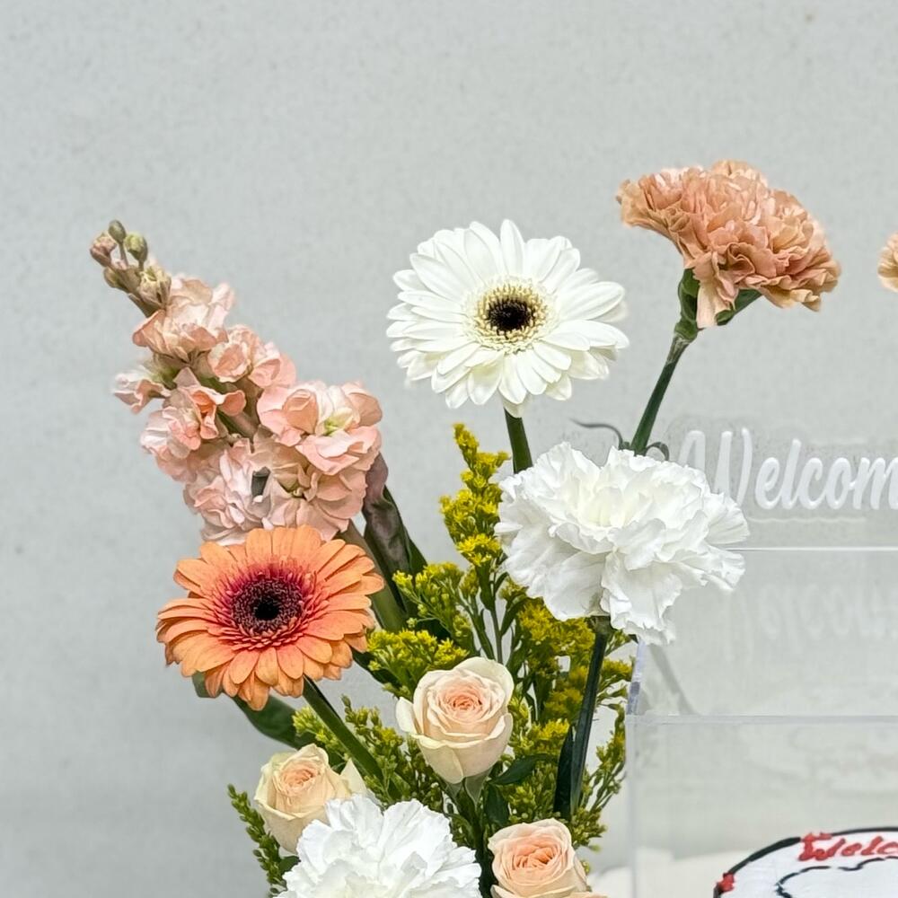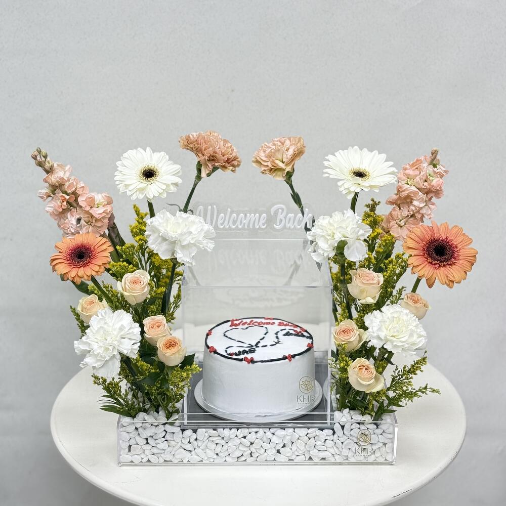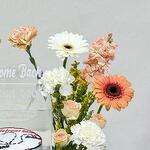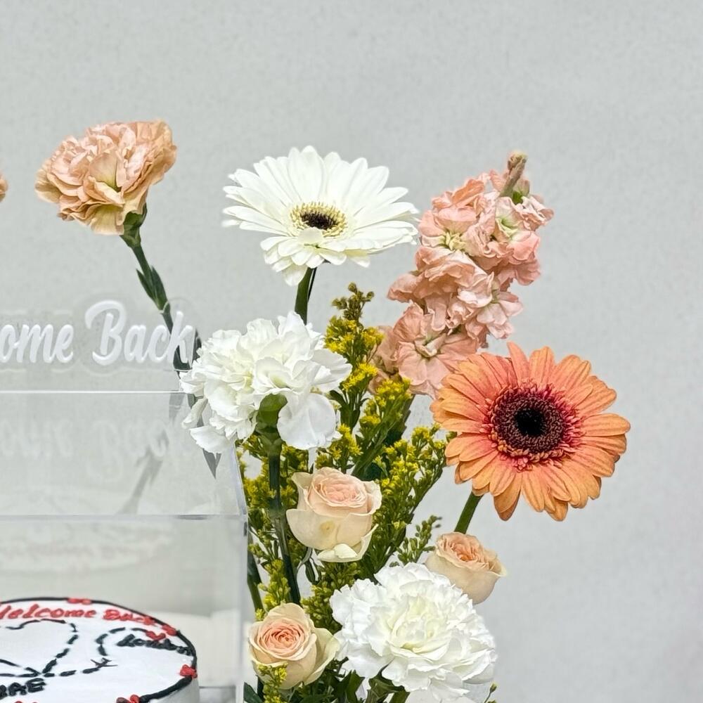 Solidago - 3 pce Gerbera - 4 pce carnation - 8 pce rose bébé - 4 pce 300grm gâteau - 1 pce