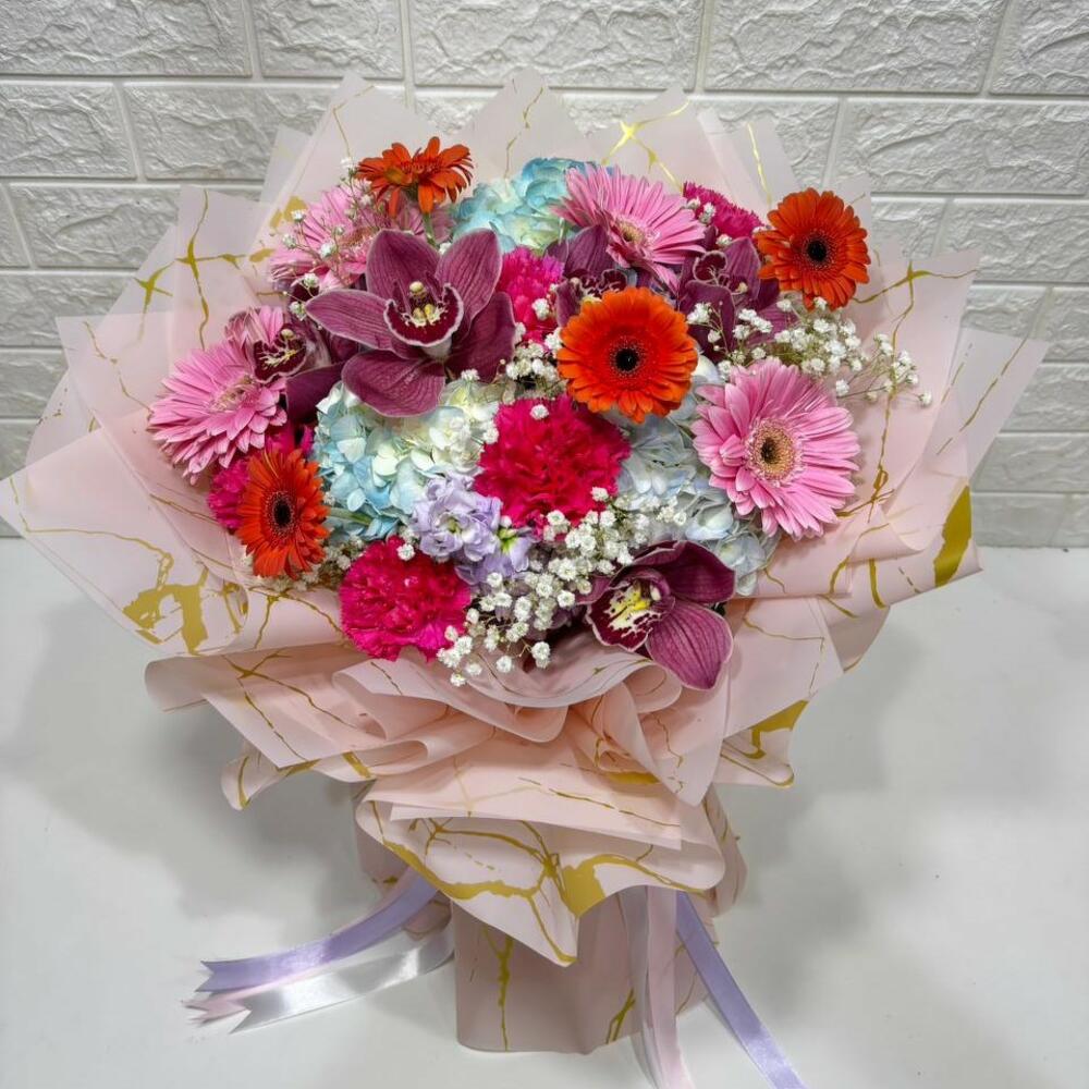 Hydrangea - 3 pce Gerbera - 8 pce Wrapping - 4 pce carnation - 3 pce cymbidium - 5 pce