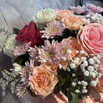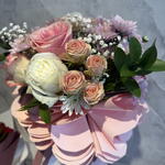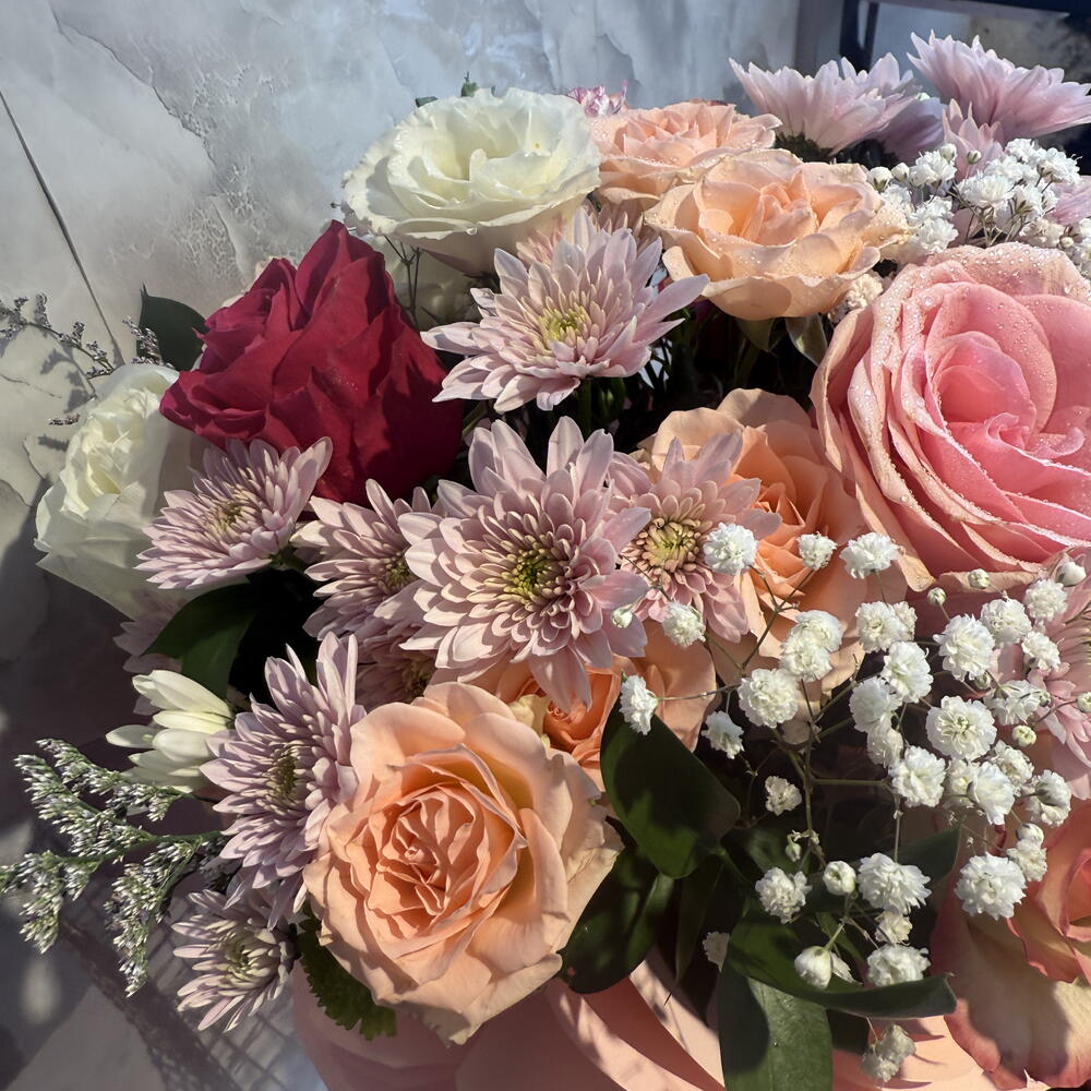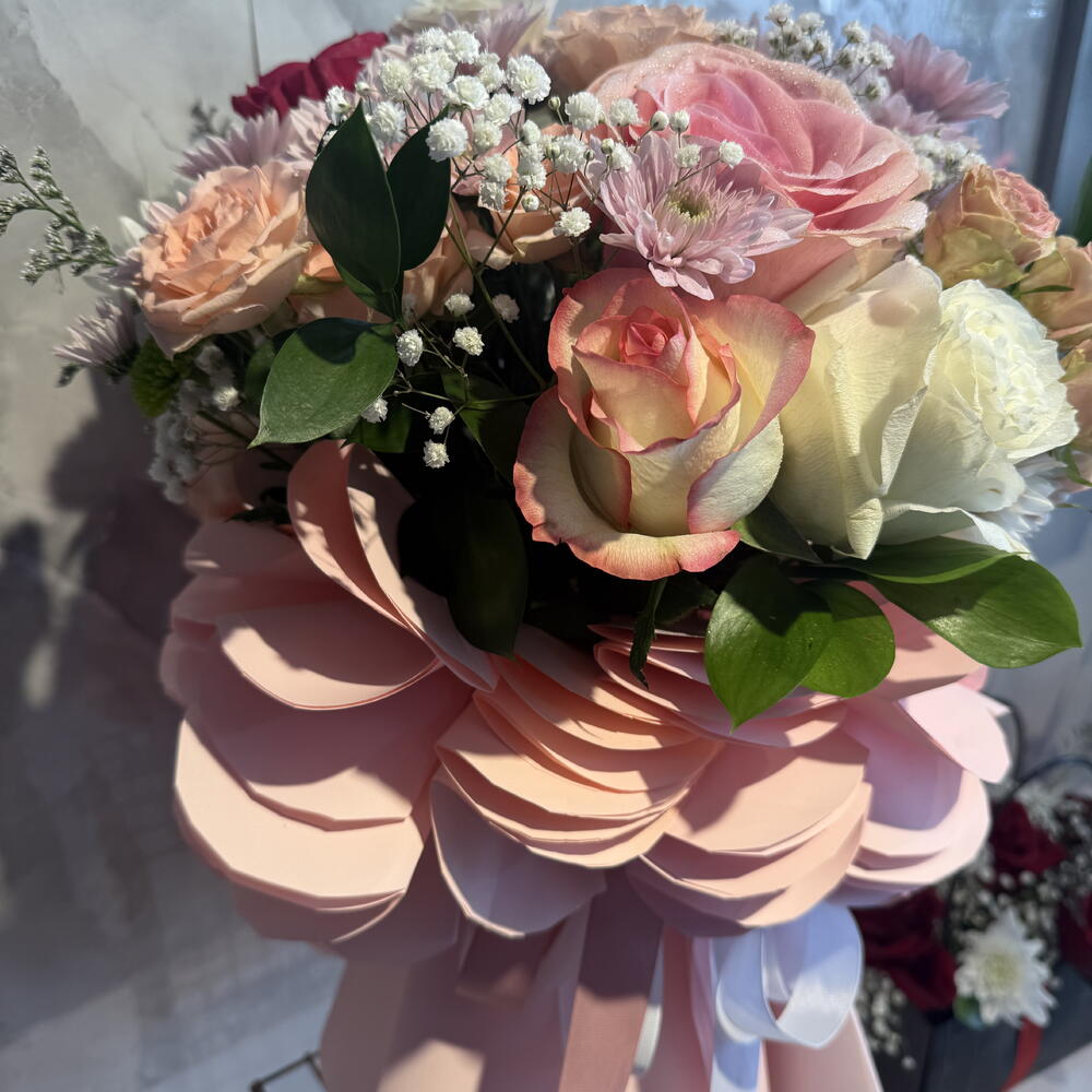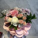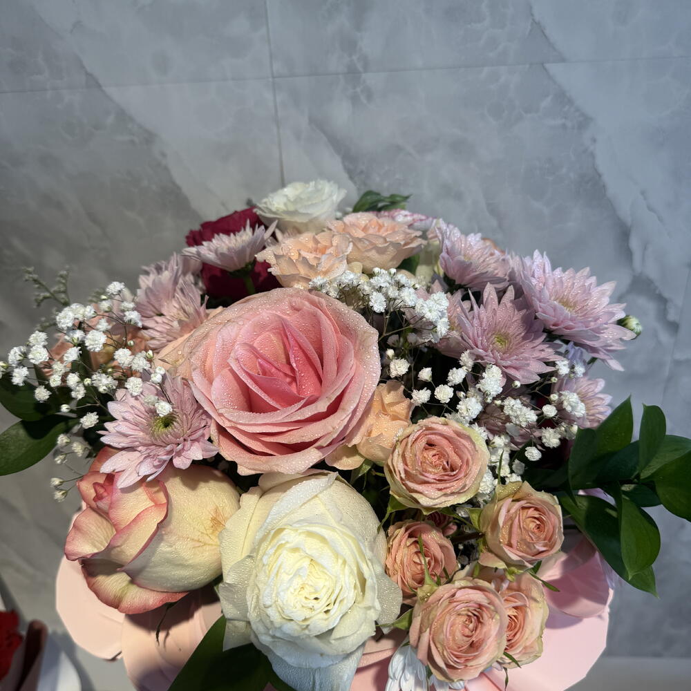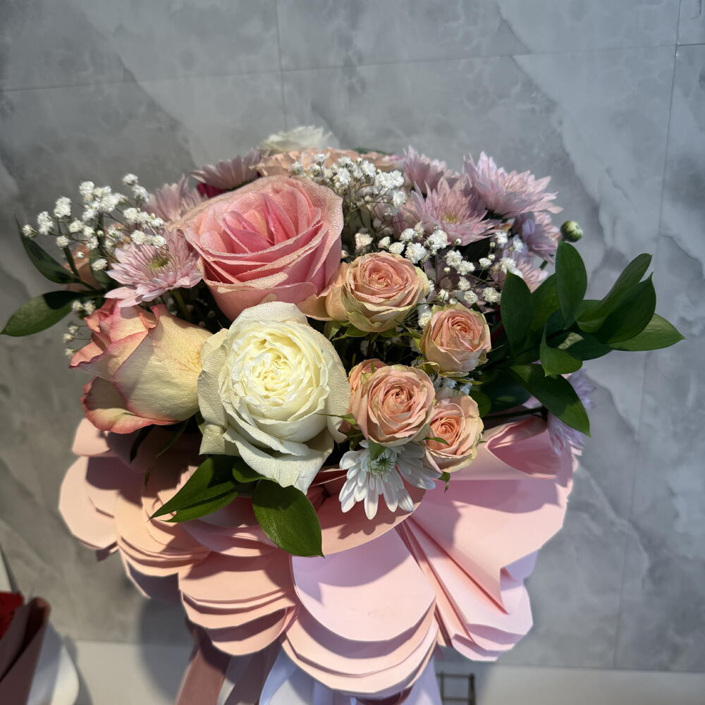 Ruscus - 3 pce White rose - 3 pce Lisianthus - 2 pce carnation - 4 pce rose branchue rose - 4 pce chrysanthème rose - 3 pce gypsiopillia - 2 pce rose de teinte rose - 5 pce
