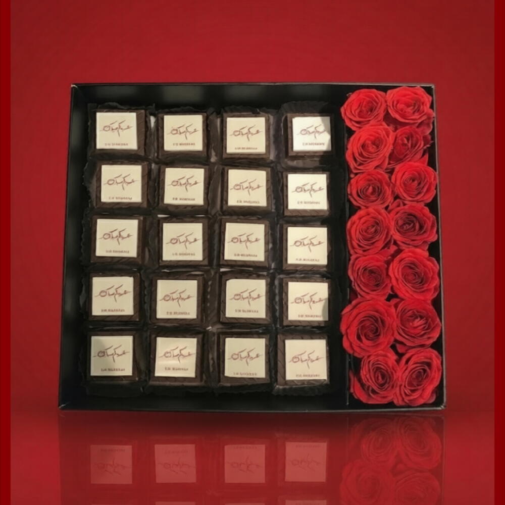 Laissez-vous tenter par notre somptueux panier cadeau, magnifiquement composé de 20 pièces de chocolats imprimés et décadents, offrant de délicieux instants fondants. Accompagné de 15 roses charmantes pour accroître la joie, il sert de symbole élégant de votre affection. Cette composition luxueuse est le cadeau idéal pour toutes les occasions !