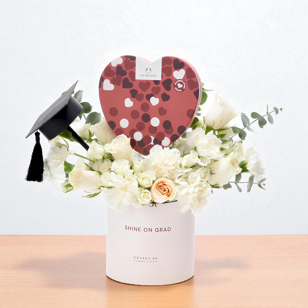 Associé au coffret cadeau ‘Sweetest Strawberry Heart’ de The Body Shop (crème pour les mains, beurre corporel, baume à lèvres) Présenté dans une boîte ronde rose pastel signature ZUVEES, embossée du message “Shine On Grad” et surmontée d’un mini chapeau de graduation, ce coffret cadeau réfléchi capture l’essence de la célébration, de l’amour et du soin de soi. ✨ Veuillez noter : le message sur la boîte peut également être personnalisé sur demande. Les options disponibles incluent : Shine On Grad, Dream. Achieve. Inspire., et Hats off Champion.