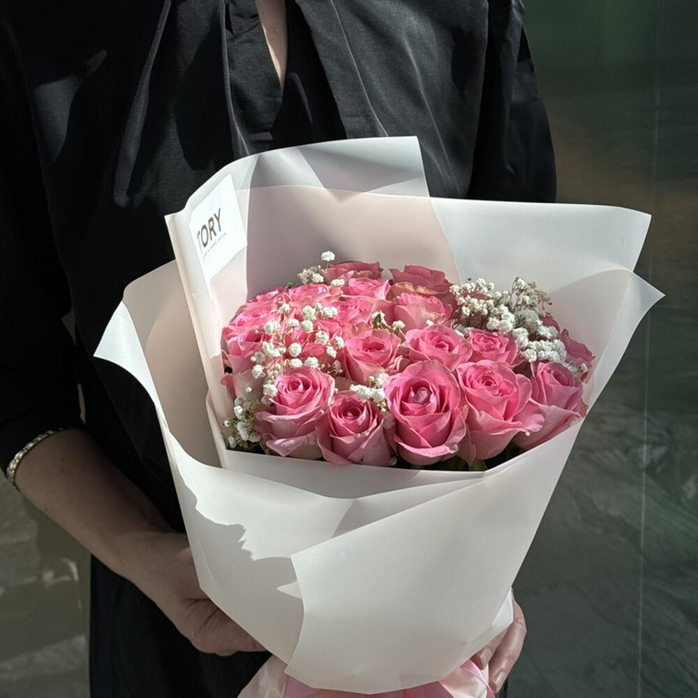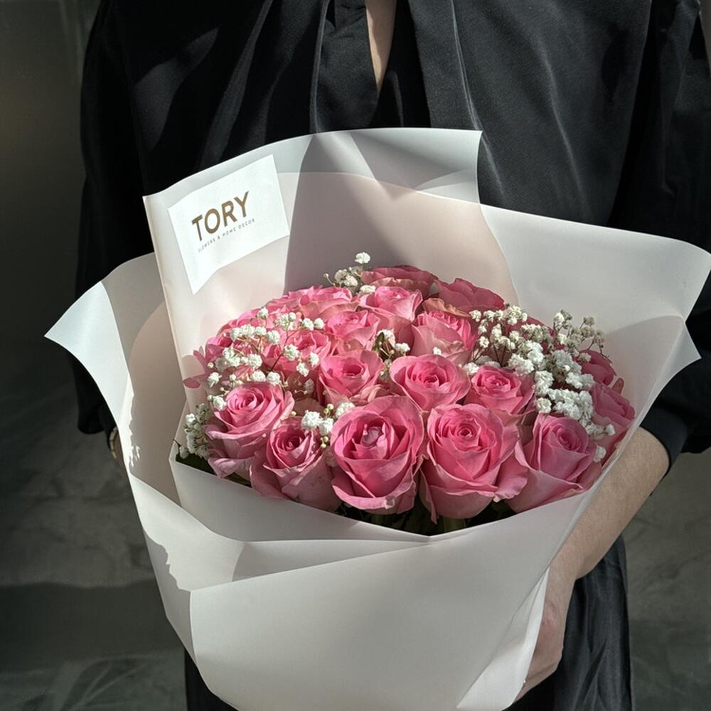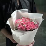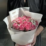 Composition: rose rose - 21, Gypsophila - 2, papier d'emballage pour fleurs - 1 Tailles: LARGEUR - 35CM; HAUTEUR - 50CM; LONGUEUR - 50CM; (y compris l'emballage) Taille: 35 x 50 x 50 cm