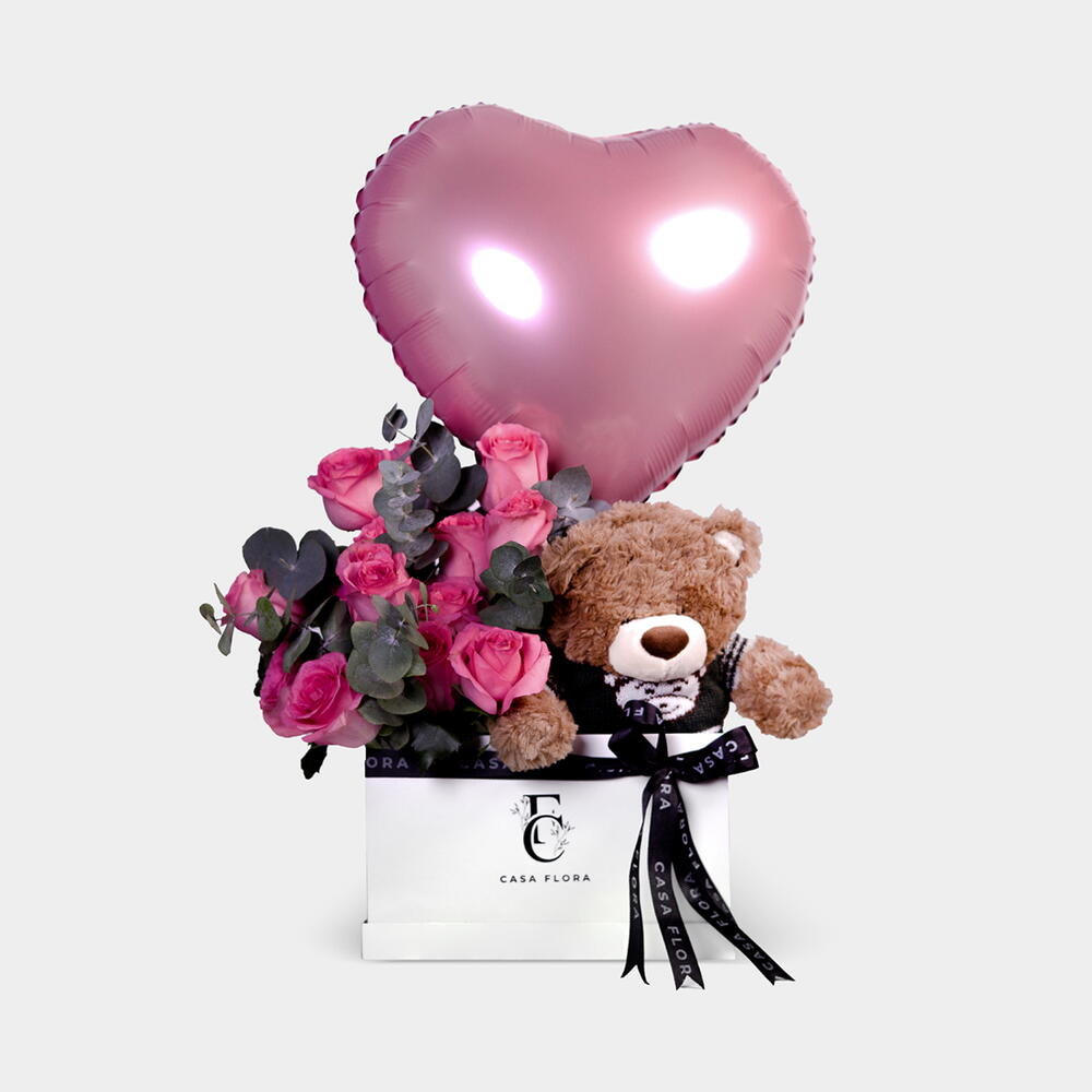 Une douce combinaison d'un ours en peluche câlin, une douzaine de roses rose pâle, 16 chocolats délicieux, et un ballon en forme de cœur vibrant. Le cadeau parfait pour exprimer l'amour et rendre chaque instant inoubliable Boîte taille X-Large 25 cm longueur X 25 cm largeur X 15 cm hauteur