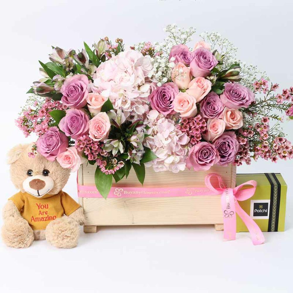 Détails du produit: Chocolats Patchi Deluxe 250 grammes, peluche « You Are Amazing » 20 cm, 2 hortensias roses, 10 roses violettes, 10 roses roses, 5 alstroemères blanches, 2 tiges de fleurs de cire violettes, feuilles et garnitures - Gypso, 3 Song of India et 2 ruscus simples, préparé dans une boîte en bois, noué avec un nœud de ruban.