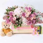 Ruscus - 2 pce Pink rose - 10 pce alstroemère blanche - 5 pce rose violette - 10 pce boîte en bois - 1 pce pink hydrangea - 2 pce cire violette - 2 pce Chanson de l'Inde - 3 pce tu es un ours en peluche incroyable - 1 pce Boîte Patchi 250 g - 1 pce