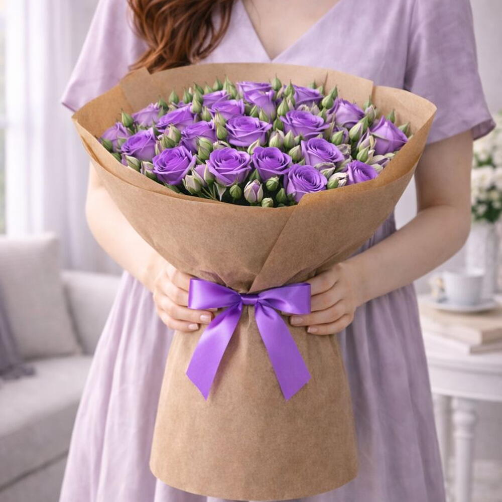 Élégantes mini-roses violettes de notre collection Baby Kiss. 10 tiges joliment emballées dans du papier brun avec un ruban assorti. Parfaites pour des cadeaux uniques, modernes et stylés.