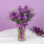 11 matthiolas violettes, feuilles - 3 tiges de feuilles Palviforia, disposées dans un vase cylindrique en verre - 10x20 cm.