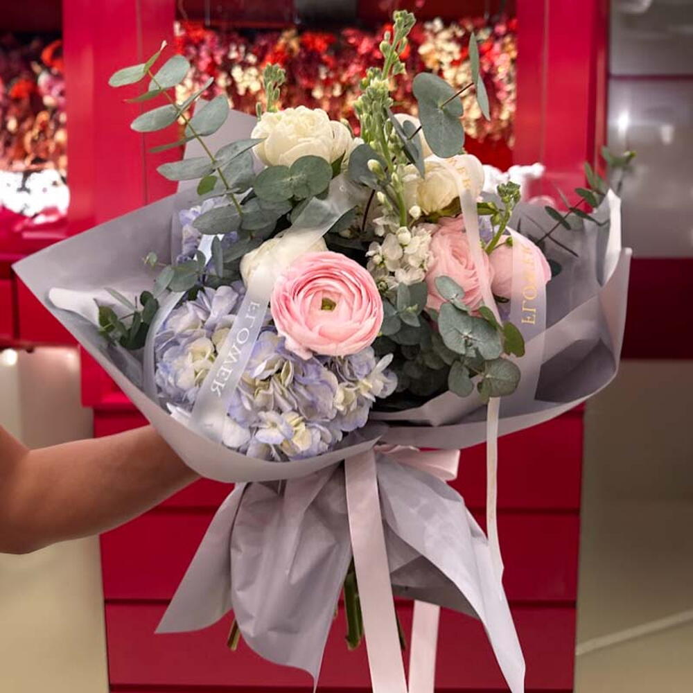 Le bouquet Purple Melody Love — un mélange époustouflant d'hortensias premium, de pivoines luxuriantes, de matthiolas parfumés et de renoncules délicates. Une composition petite mais luxueuse conçue pour captiver et enchanter les sens.