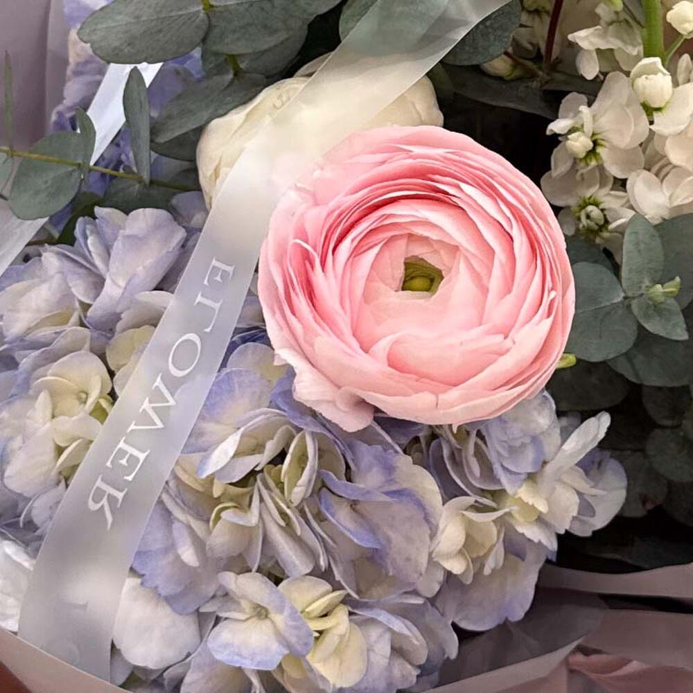 Eucalyptus - 1 pce renoncule rose - 3 pce pivoine blanche - 3 pce matthiola blanche - 5 pce hortensia bleu clair - 1 pce