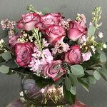 Wax flower - 3 pce rose violette - 10 pce matthiola violette - 3 pce eucalyptus - 3 pce vase en verre 15 x 12 - 1 pce