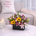 Des - Arrangement floral en sachet composé de 2 tournesols, 7 roses violet foncé, 5 roses roses, 3 tulipes violettes, 3 tulipes blanches et 5 tulipes roses décorées de cire rose dans un sachet noué avec un ruban rose.
