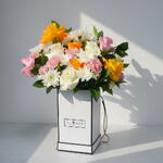 Un arrangement floral lumineux et gai qui apporte fraîcheur et joie à n'importe quel espace. Des roses jaunes ensoleillées, des fleurs rose pâle et des fleurs blanches classiques créent une composition vivante et harmonieuse. Des textures délicates et des couleurs vibrantes confèrent à la composition une allure à la fois ludique et élégante. Un feuillage vert luxuriant ajoute de l'équilibre et un contraste naturel aux fleurs. Présentée dans une boîte à fleurs blanche et épurée au design moderne, elle a une allure sobre et élégante. Parfaite pour les célébrations, comme cadeau ou pour sublimer la décoration intérieure. Cette composition emplit chaque instant de lumière, de chaleur et d'énergie positive.