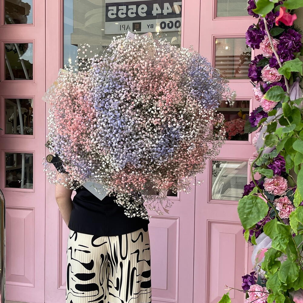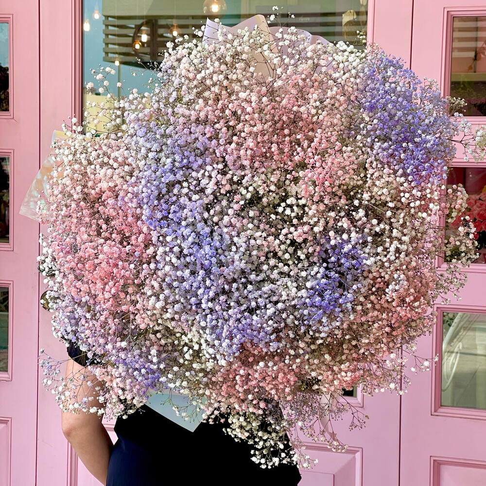 Un bouquet arc-en-ciel de gypsophiles, plus grand que nature, aux pastels doux, est peut-être la plus joyeuse des offres florales ! On ne peut s'empêcher de sourire en le voyant !