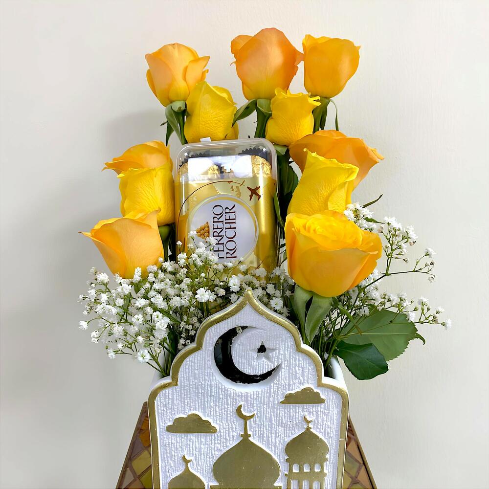 7 roses jaunes 7 roses orange 1 chocolat Ferrero Rocher dans boîte de Ramadan fait main