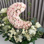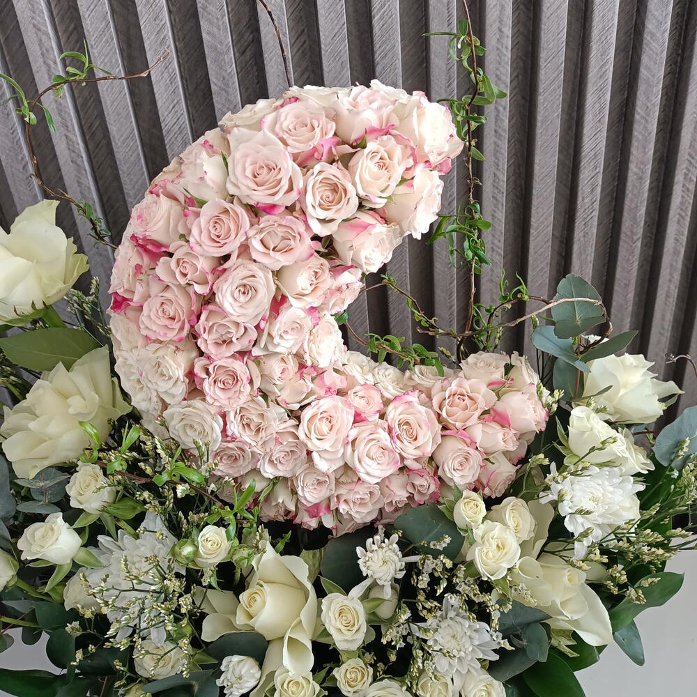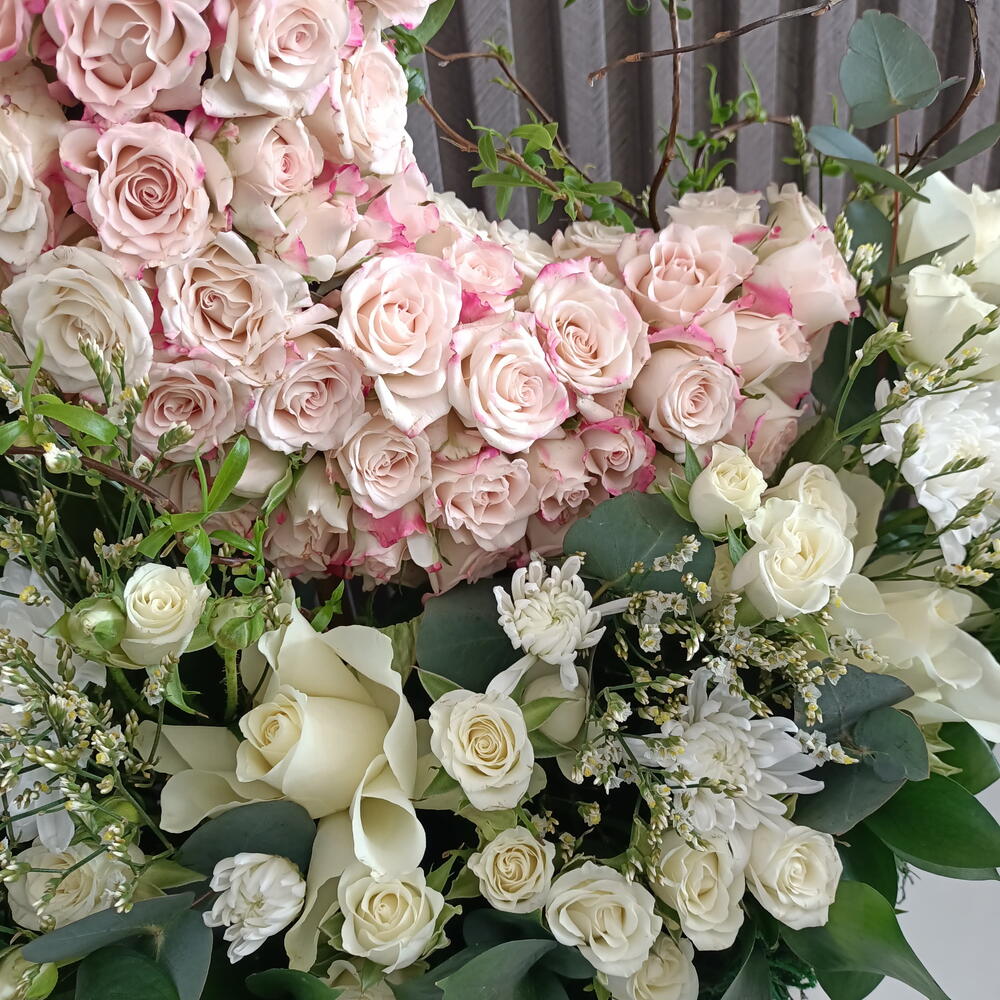 Eucalyptus - 2 pce Limonium - 4 pce Mousse - 1 pce plateau en cuir - 1 pce roses - 5 pce spray roses - 25 pce ruscuss - 7 pce crazantimo - 1 pce