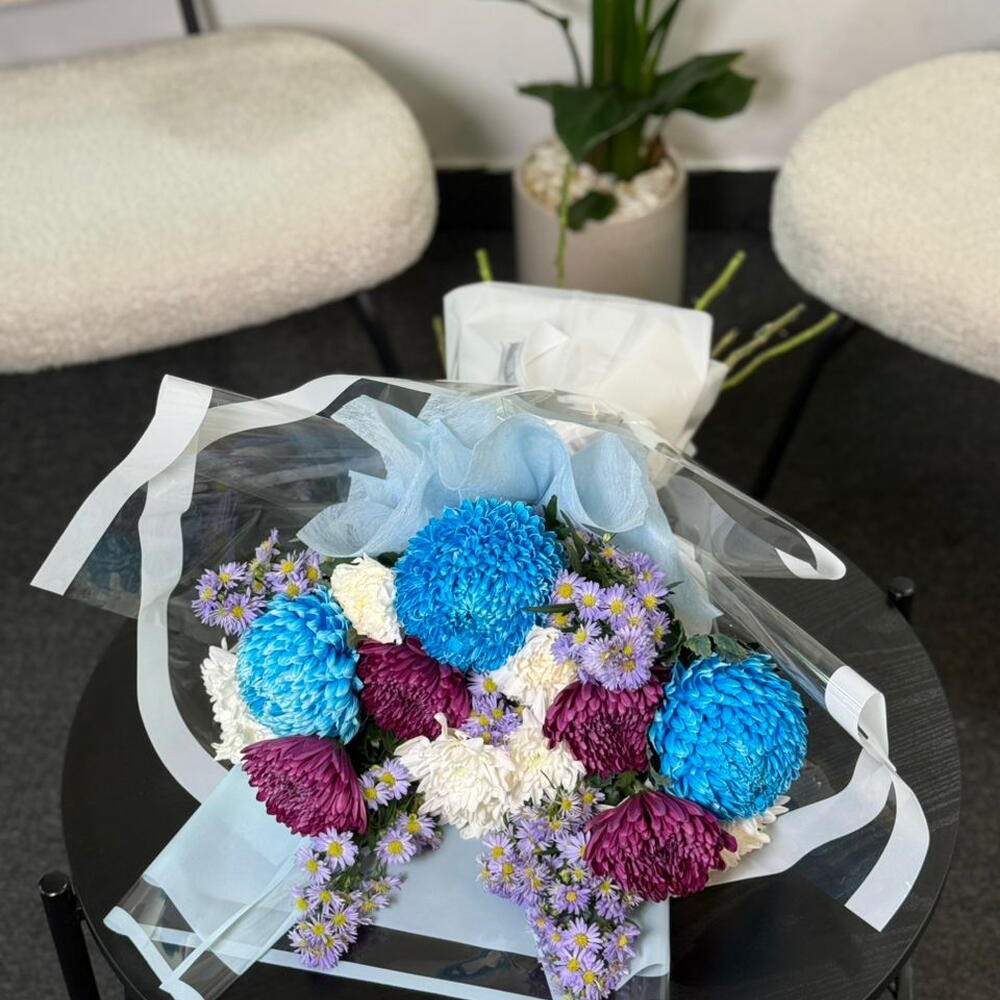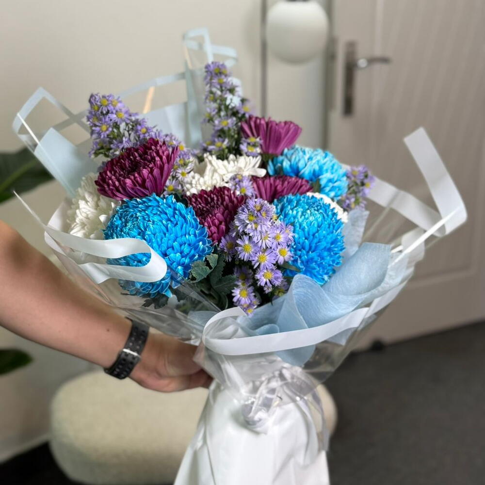 carnation white - 2 pce spray de chrysanthème blanc - 3 pce aster cassandra - 5 pce snowdown teint en bleu - 3 pce chrysanthème andrea violet - 4 pce