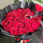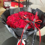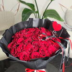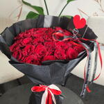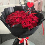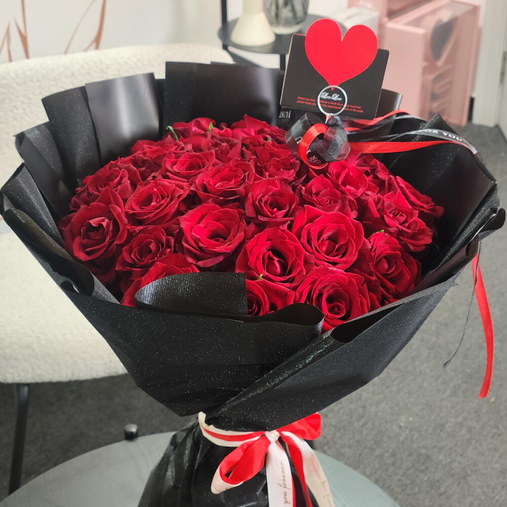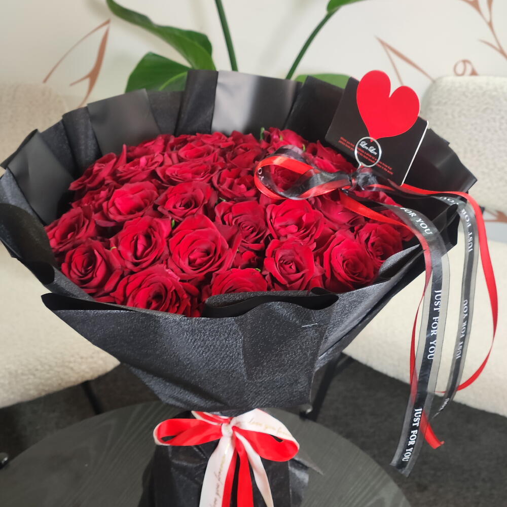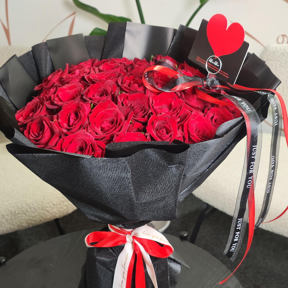 Un bouquet saisissant, lié à la main, de roses rouges luxuriantes, enveloppé dans un élégant papier noir mat et agrémenté de rubans rouge et noir. Audacieux tout en restant romantique, cet arrangement symbolise un amour profond, la passion et une dévotion intemporelle—parfait pour les anniversaires, la Saint-Valentin ou une puissante déclaration d'amour. 🌹❤️