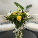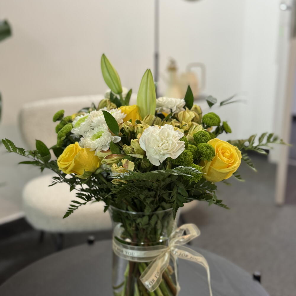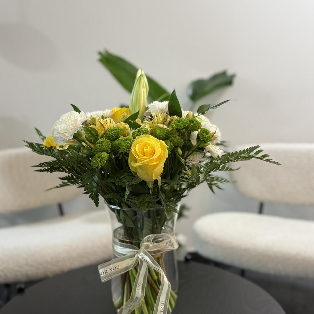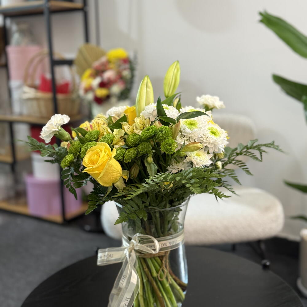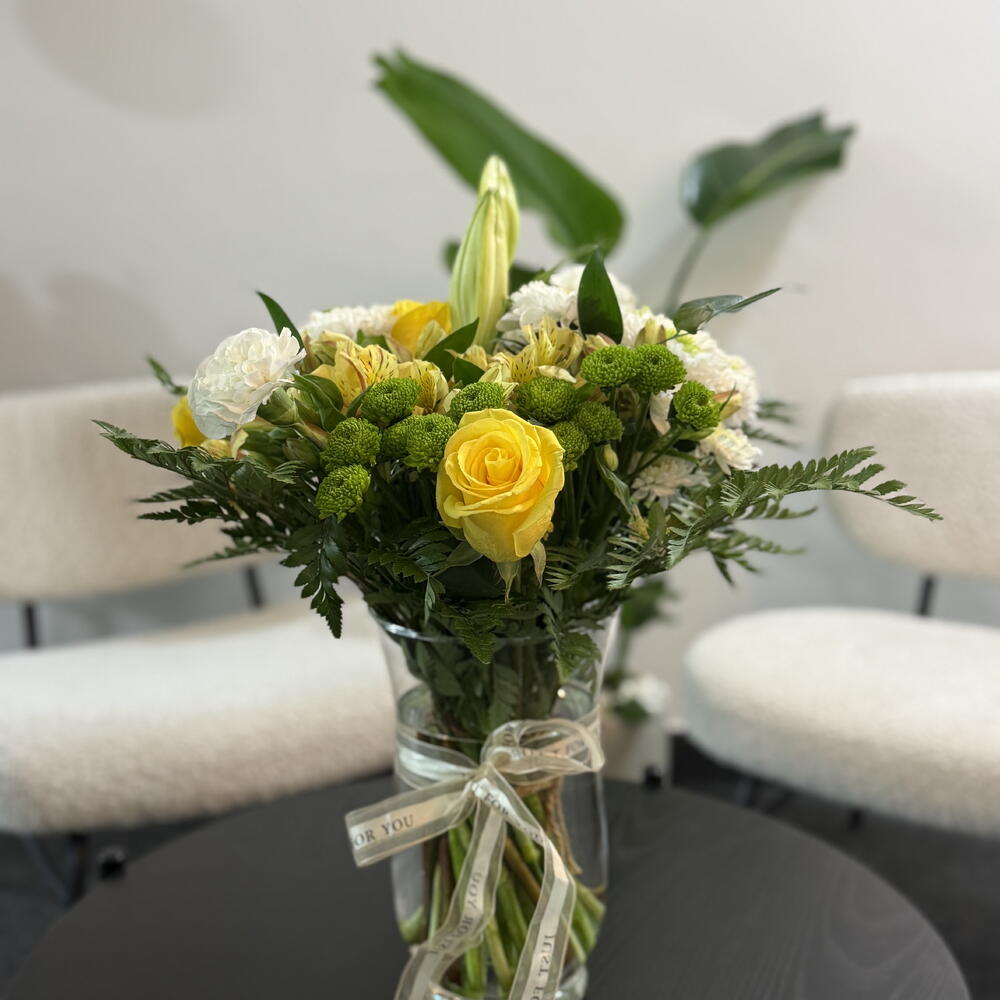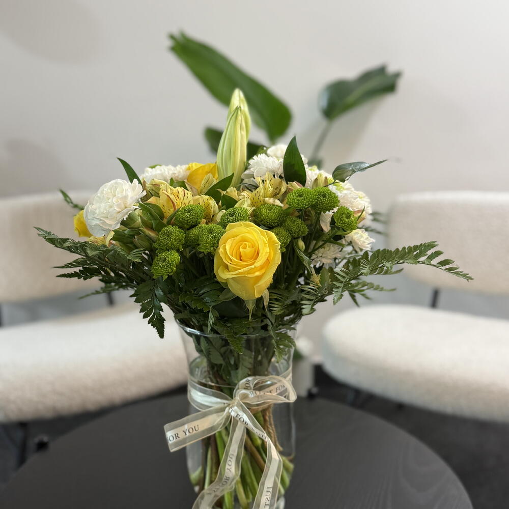 Ce bouquet est un mélange frais et élégant de fleurs jaune pâle et blanches, disposées avec une sensation naturelle, inspirée du jardin. Des roses jaune vif apportent une touche de couleur joyeuse, tandis que des œillets blanc crémeux et des chrysanthèmes blancs offrent une note douce et classique. Des boutons de lys fermés se dressent au centre, conférant à la composition une structure gracieuse et raffinée et laissant présager des fleurs encore à éclore. Des chrysanthèmes boutons verts et des grappes de feuillage frais créent un contraste vivant dans l'ensemble, ajoutant profondeur et texture. Le bouquet est réuni dans un vase en verre transparent, noué d'un délicat ruban crème, lui offrant une présentation nette, soignée et pleine d'attention. Dans l'ensemble, il a un aspect lumineux et réjouissant — parfait pour exprimer la joie, la reconnaissance ou des vœux chaleureux.